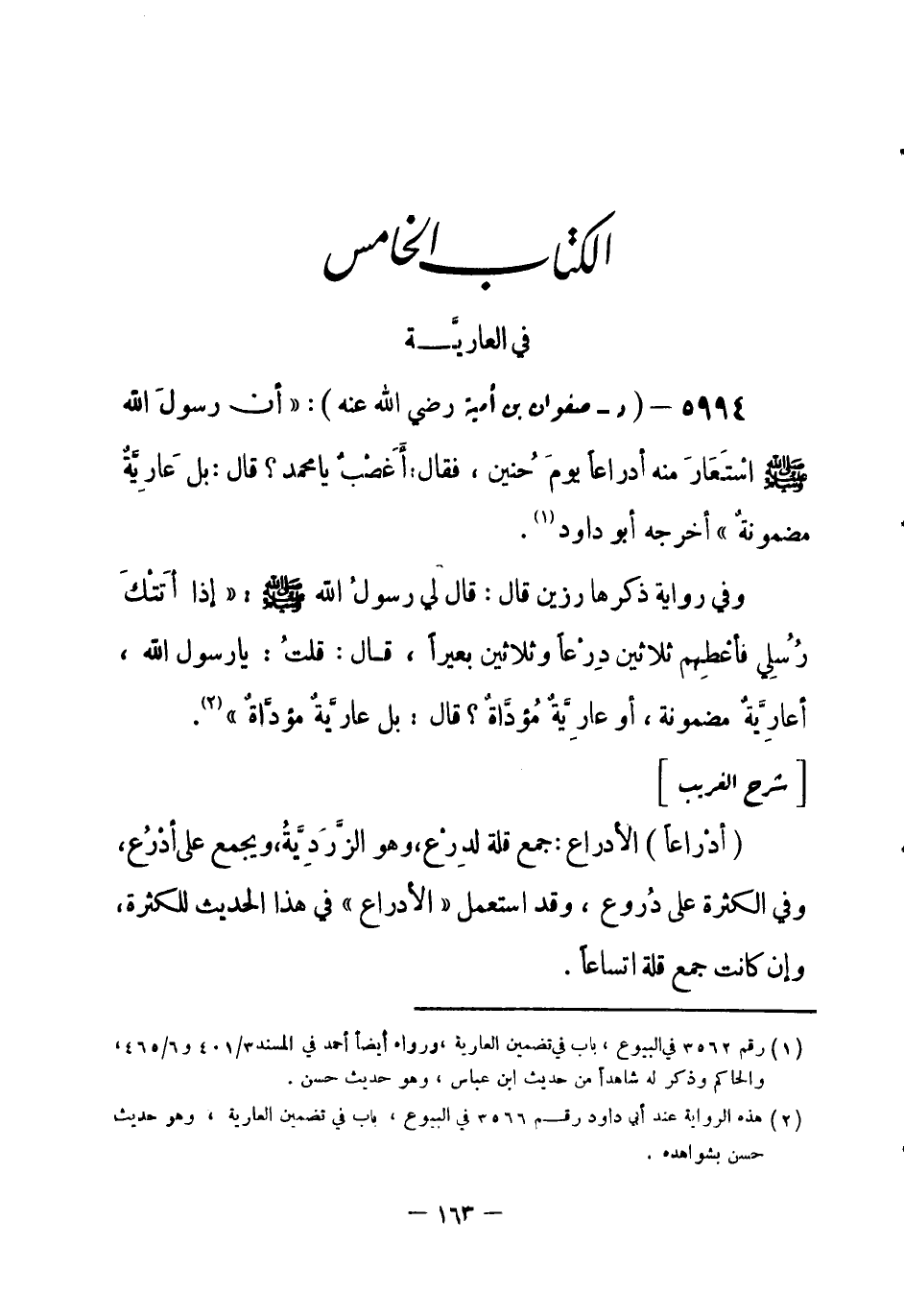 5994 - (د) صفوان بن أمية - رضي الله عنه - «أن رسولَ الله - صلى الله عليه وسلم- اسْتَعَارَ مِنه أدراعاً يومَ حُنين، فقال: أَغَصْبٌ يا محمد؟ قال: بل عَارِيَّة مضمونة» . أخرجه أبو داود (¬1) .