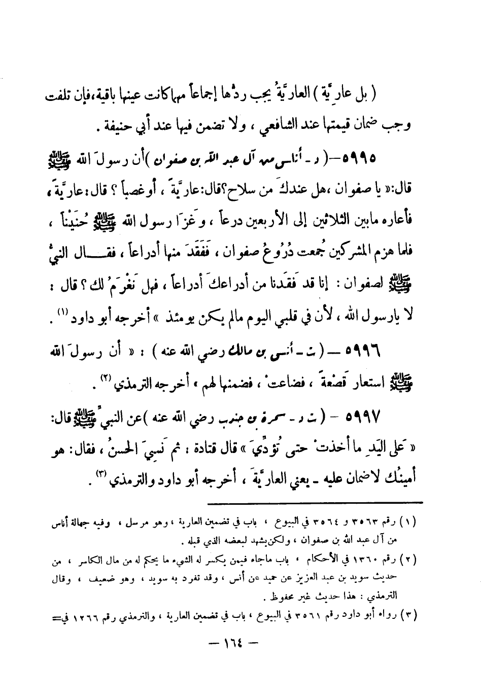5995 - (د) أناس من آل عبد الله بن صفوان أن رسولَ الله - صلى الله عليه وسلم- قال: «يا صفوان، هل عندكَ من سلاح؟ قال: عَاريَّة، أو غصباً؟ قال: عاريَّة، فأعاره ما بين الثلاثين إلى الأربعين درعاً، وَغَزَا رسولُ الله - صلى الله عليه وسلم- حُنَيْناً، فلما هزم المشركين جُمعت دُرُوعُ صفوان، فَفَقَدَ منها أدراعاً، فقال النبيُّ - صلى الله عليه وسلم- لصفوان: إنا قد فَقَدنا من أدراعك أدراعاً، فهل نَغْرَمُ لك؟ قال: لا يا رسولَ الله، لأن في قلبي اليوم ما لم يكن يومئذ» . أخرجه أبو داود (¬1) .