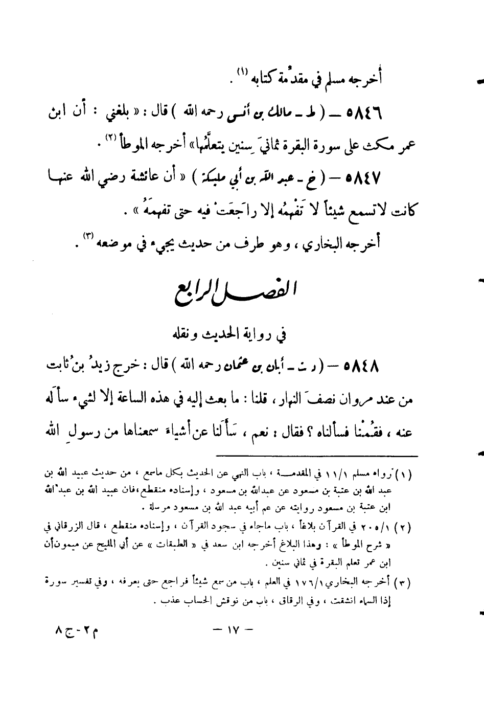 5846 - (ط) مالك بن أنس - رحمه الله - قال: «بلغني: أن ابن عمر مكث على سورة البقرة ثمانيَ سِنين يتعلَّمُها» . أخرجه الموطأ (¬1) .