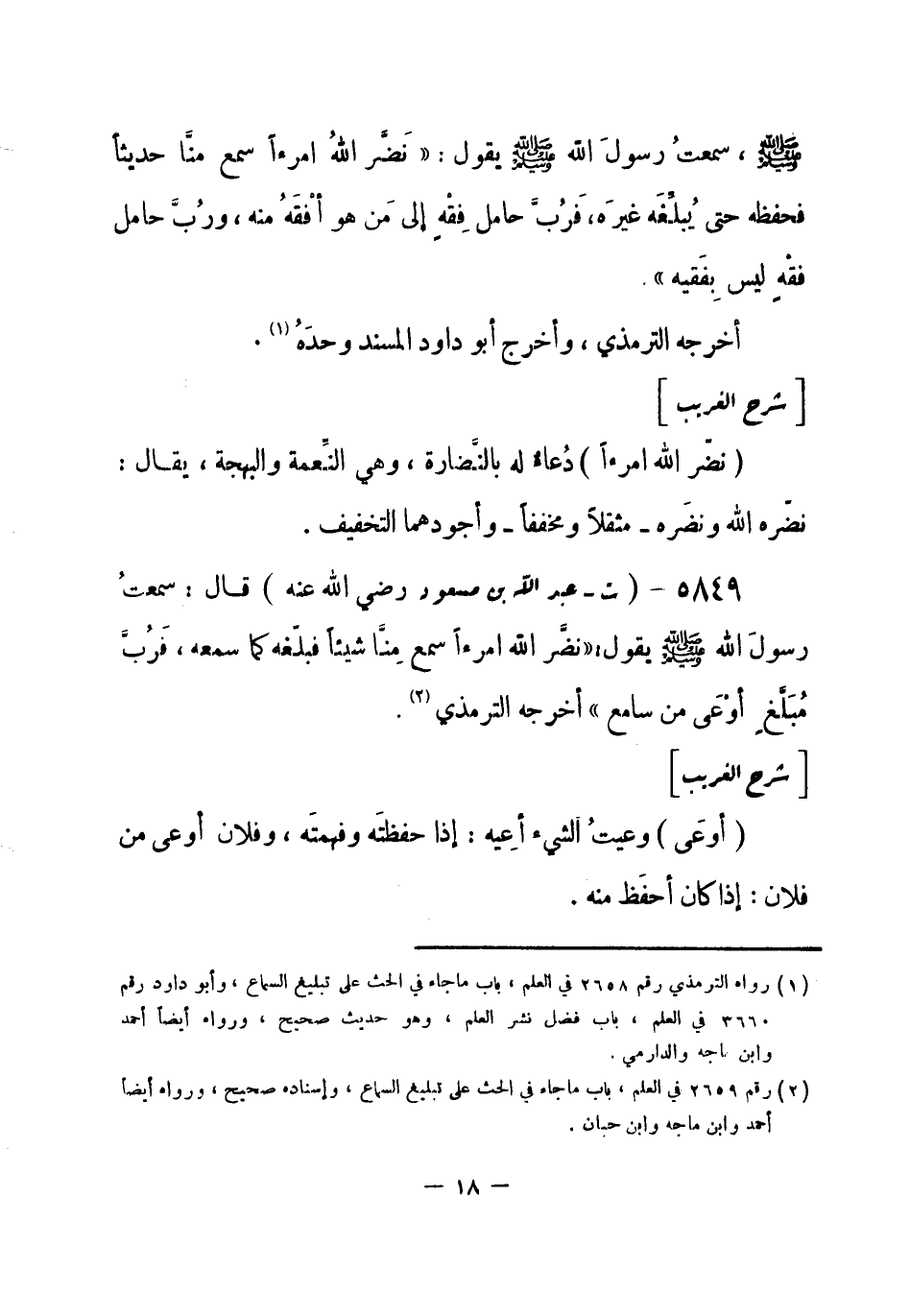 5849 - (ت) عبد الله بن مسعود - رضي الله عنه - قال: سمعتُ رسولَ الله - صلى الله عليه وسلم- يقول: «نضَّر الله امرءاً سمع منَّا شيئاً، فبلّغه كما سمعه، فَرُبَّ مُبَلَّغ أوْعَى من سامع» . أخرجه الترمذي (¬1) .