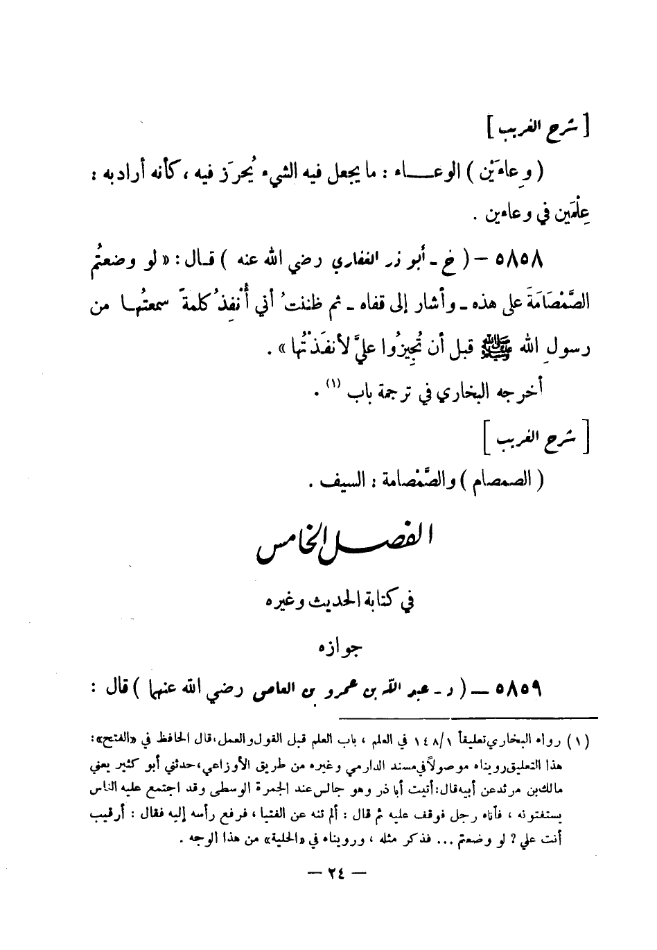 5858 - (خ) أبو ذر الغفاري - رضي الله عنه - قال: «لو وضعتُم الصَّمْصَامَة على هذه - وأشار إِلى قفاه - ثم ظننتُ أني أُنْفِذُ كلمة سمعتُها من رسولِ الله - صلى الله عليه وسلم- قبل أن تُجِيزُوا عليَّ لأنفَذْتُها» . أخرجه البخاري في ترجمة باب (¬1) .