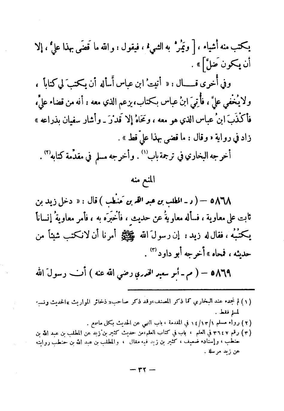 5868 - (د) المطلب بن عبد الله بن حَنْطب قال: «دخل زيد بن ثابت على معاوية، فسأله معاويةُ عن حديث، فأخْبَرَه به، فأمر معاويةُ إِنساناً يكتُبُه، فقال له زيد: إن رسولَ الله - صلى الله عليه وسلم- أمرنا أن لا نكتب شيئاً من حديثه، فمحاه» . أخرجه أبو داود (¬1) .