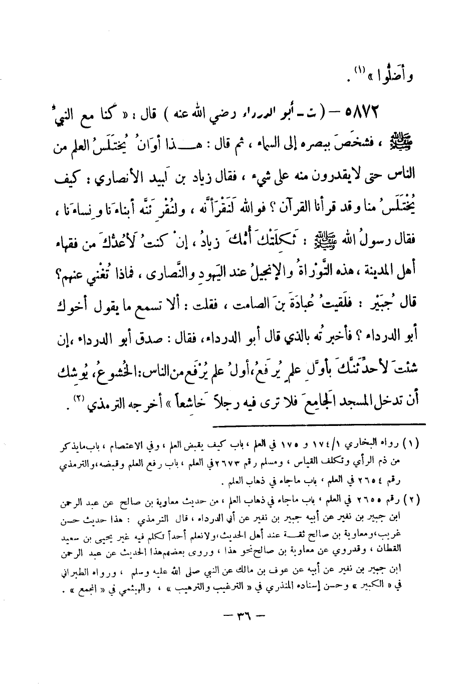 5872 - (ت) أبو الدرداء - رضي الله عنه - قال: «كنا مع النبيِّ - صلى الله عليه وسلم-، فشخَصَ ببصره إلى السماء، ثم قال: هذا أوَانُ يُختَلَسُ العلم من الناس حتى لا يقدرون منه على شيء، فقال زياد بن لَبيد الأنصاري: كيف يُخْتَلَسُ منا وقد قرأنا القرآن؟ فوالله لَنَقْرَأنَّه، ولَنُقْرِئَنَّه أبناءَنا ونِساءَنا، فقال رسولُ الله - صلى الله عليه وسلم-: ثَكِلَتْكَ أُمُّكَ زيادُ، إنْ كنتُ لأعُدُّكَ من فقهاء أهل المدينة، هذه التَّوْراةُ والإنجيلُ عند اليَهودِ والنَّصَارى، فماذا تُغْنِي عنهم؟ قال جُبَيْر: فلقيتُ عُبادَةَ بنَ الصامت، فقلت: ألا تسمع ما يقول أخوك أبو الدرداء؟ فأخبرتُه بالذي قال أبو الدرداء، فقال: صدق أبو الدرداء، إن شئتَ لأحدِّثَنَّكَ بأوَّلِ علم يُرفَعُ، أولُ علم يُرفعُ من الناس: الخُشوعُ، يُوشِك أن تدخل المسجد الجَامعَ فلا ترى فيه رجلاً خاشِعاً» . أخرجه الترمذي (¬1) . -[37]-