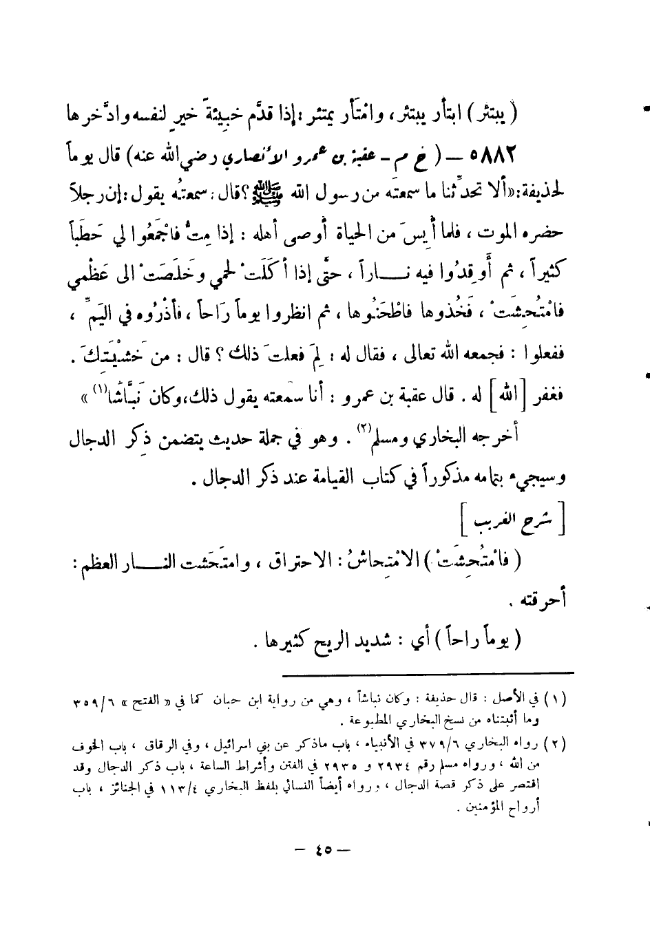 5882 - (خ م) عقبة بن عمرو الأنصاري - رضي الله عنه - قال يوماً لحذيفة: «ألا تحدثنا ما سمعتَه من رسول الله - صلى الله عليه وسلم-؟ قال: سمعتُه يقول: إن رجلاً حضره الموت، فلما أيِسَ من الحياة أوصى أهله: إذا مِتُّ فاجْمَعُوا لي حَطَباً كثيراً، ثم أوقِدُوا فيه ناراً، حتَّى إذا أكَلَتْ لحمي وخَلَصَتْ إلى عَظْمي فامْتُحِشَتْ، فَخُذوها فاطْحَنُوها، ثم انظروا يوماً رَاحاً، فأذْرُوه في اليَمِّ، ففعلوا، فجمعه الله تعالى، فقال له: لِمَ فعلتَ ذلك؟ قال: من خَشْيتكَ. فغفَر [الله] له» . قال عقبة بن عمرو: أنا سمعته يقول ذلك، وكان نَبَّاشاً (¬1) . أخرجه البخاري، ومسلم (¬2) . وهو في جملة حديث يتضمن ذِكر الدجال وسيجيء بتمامه مذكوراً في كتاب القيامة عند ذكر الدجال.