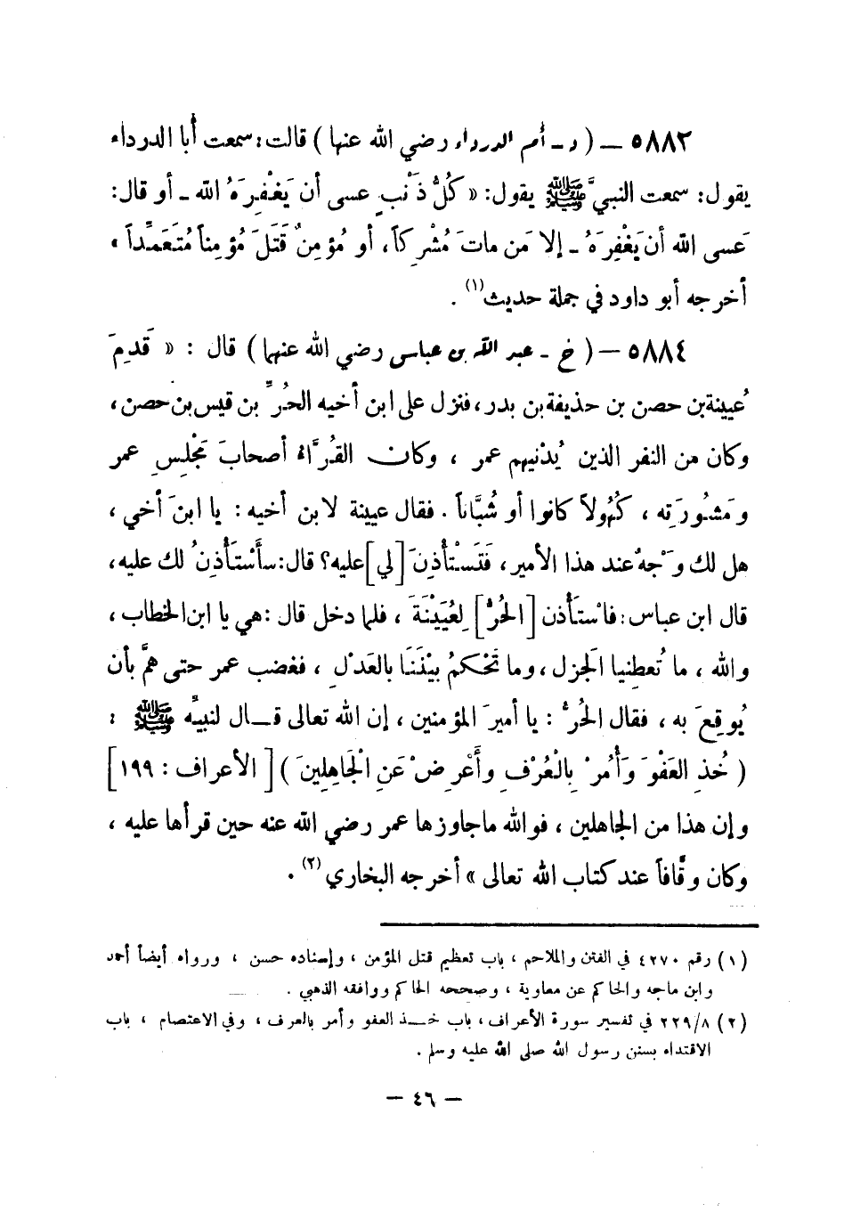 5884 - (خ) عبد الله بن عباس - رضي الله عنهما - قال: «قَدِمَ عُيينة بن حصن بن حذيفة بن بدر، فنزل على ابن أخيه الحُرِّ بن قيس بن حصن، وكان من النفر الذين يُدْنيهم عمر، وكان القُرَّاءُ أصحابَ مَجْلِسِ عمر ومَشُورَتِه، كُهُولاً كانوا أو شُبَّاباً. فقال عيينة لابن أخيه: يا ابنَ أخي، هل لك وَجْه عند هذا الأمير، فَتَسْتأْذِنَ [لي] عليه؟ قال: سأسْتَأْذِنُ لك عليه، قال ابن عباس: فاسْتَأْذن [الحُرُّ] لِعُيَيْنَةَ، فلما دخل قال: هي يا ابن الخطاب، والله ما تُعطِينا الجَزل، وما تَحْكُم بيْنَنَا بالعَدْلِ، فغضب عمر حتى همَّ بأن يُوقِعَ به، فقال الحُرُّ: يا أميرَ المؤمنين، إِن الله تعالى قال لنبيِّه - صلى الله عليه وسلم-: {خُذِ العَفْوَ وَأْمُرْ بِالْعُرْفِ وأَعْرِضْ عَنِ الجَاهِلِينَ} [الأعراف: 199] ، وإن هذا من الجاهلين، فوالله ما جاوزها عمر - رضي الله عنه - حين قرأها عليه، وكان وقّافاً عند كتاب الله تعالى» . أخرجه البخاري (¬1) . -[47]-