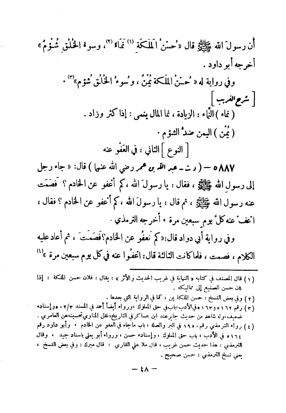 5887 - (د ت) عبد الله بن عمر - رضي الله عنهما - قال: «جاء رجل إلى رسولِ الله - صلى الله عليه وسلم-، فقال: يا رسولَ الله، كم أعْفو عن الخادم؟ فَصَمَت عنه رسول الله - صلى الله عليه وسلم-، ثم قال: يا رسولَ الله، كم أعْفو عن الخادم؟ فقال: اعْف عنه كلَّ يوم سبعين مرة» أخرجه الترمذي.