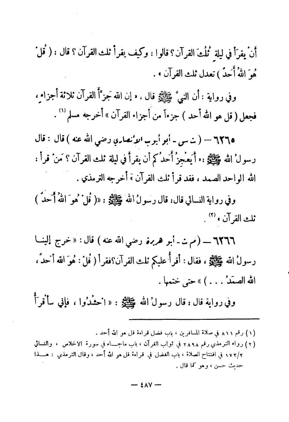 6265 - (ت س) أبو أيوب الأنصاري - رضي الله عنه - قال: قال رسولُ الله - صلى الله عليه وسلم-: «أَيَعْجِزُ أَحَدُكم أن يقرأَ في ليلة ثلث القرآن؟ مَنْ قرأ: الله الواحد الصمد، فقد قرأ ثلث القرآن» أخرجه الترمذي.