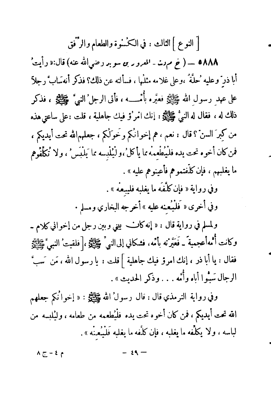 5888 - (خ م د ت) المعرور بن سويد - رضي الله عنه - قال: «رأيتُ أبا ذرّ وعليه حُلَّة، وعلى غلامه مثلُها، فسألته عن ذلك؟ فذكر أنه سَابَّ رجلاً على عهدِ رسولِ الله - صلى الله عليه وسلم- فعيَّره بأُمِّه، فأتى الرجلُ النبيَّ - صلى الله عليه وسلم-، فذكر ذلك له، فقال له النبيُّ - صلى الله عليه وسلم-: إِنك امْرُؤ فيك جاهلية، قلت: على ساعتي هذه من كِبرَ السنّ؟ قال: نعم، هم إِخوانُكم وَخَوَلُكم، جعلهم الله تحت أيديكم، فمن كان أخوه تحت يده فلْيُطْعِمْه مما يأكلُ، ولْيُلْبِسه مما يَلْبَسُ، ولا تُكلِّفُوهم ما يغلبهم، فإن كلّفتموهم فأعينوهم عليه» .