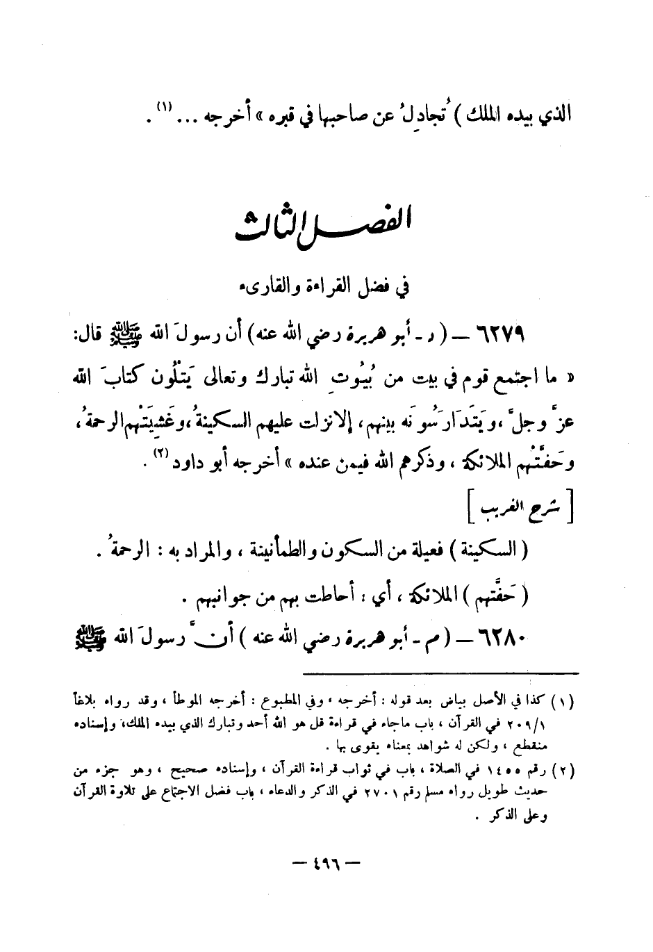6279 - (د) أبو هريرة - رضي الله عنه - أن رسولَ الله - صلى الله عليه وسلم- قال: «ما اجتمع قوم في بيت من بُيُوتِ الله تبارك وتعالى يَتْلُونَ كتابَ الله عزَّ وجلَّ، ويَتَدَارَسُونَه بينهم، إِلا نزلت عليهم السكينةُ، وَغَشِيَتْهم الرحمةُ، وحَفَّتْهم الملائكة، وذكرهم الله فيمن عنده» أخرجه أبو داود (¬1) .