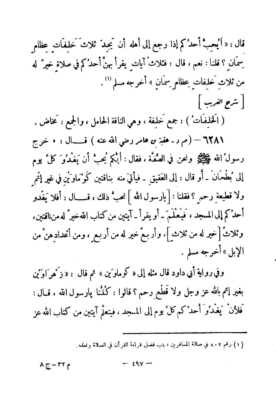 6281 - (م د) عقبة بن عامر - رضي الله عنه - قال: «خرج رسولُ الله - صلى الله عليه وسلم- ونحن في الصُّفَّة، فقال: أَيُّكم يُحبُّ أن يَغْدُوَ كلَّ يوم إلى بُطْحَانَ - أَو قال: إلى العَقيقِ - فيأتيَ منه بناقتين كَوْمَاوَيْنِ في غير إثْم ولا قطيعةِ رحم؟ فقلنا: [يا رسول الله] نحبُّ ذلك، قال: أَفلا يَغْدو أحدُكم إِلى المسجد، فَيَعْلَمَ - أو يقرأ - آيتين من كتاب الله خير له من ناقتين، وثلاث [خير له من ثلاث] ، وأربع خير له من أربع، ومن أعْدادِهنَّ من الإبل» أخرجه مسلم.