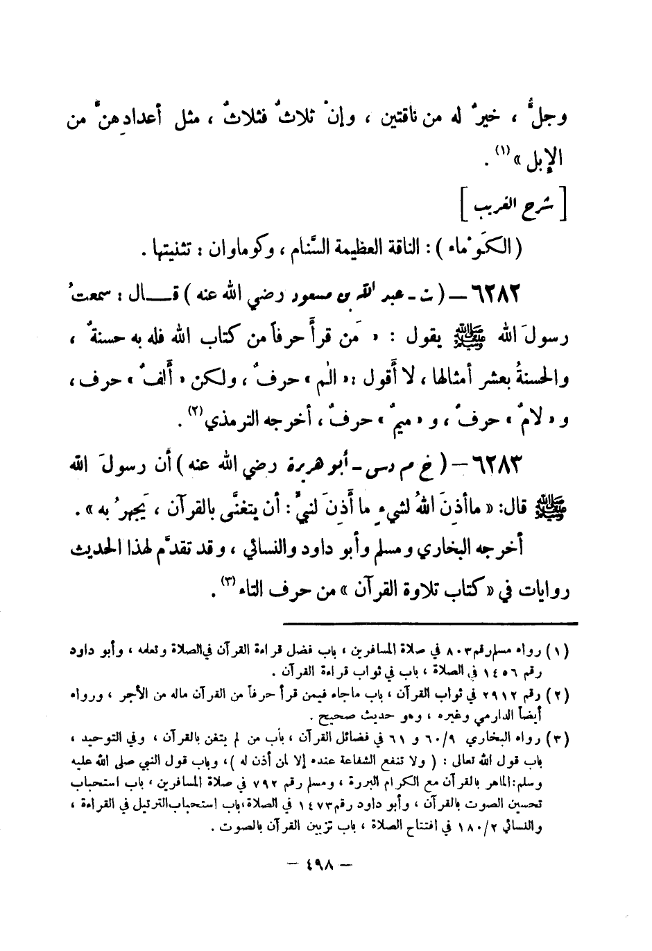 6282 - (ت) عبد الله بن مسعود - رضي الله عنه - قال: سمعتُ رسولَ الله - صلى الله عليه وسلم- يقول: «مَن قرأَ حرفاً من كتابِ الله فَلَهُ بِهِ حسنة، والحسنةُ بعشر أمثالها، لا أَقول: «الم» حرف، ولكن «أَلف» حرف، و «لام» حرف، و «ميم» حرف» أخرجه الترمذي (¬1) .