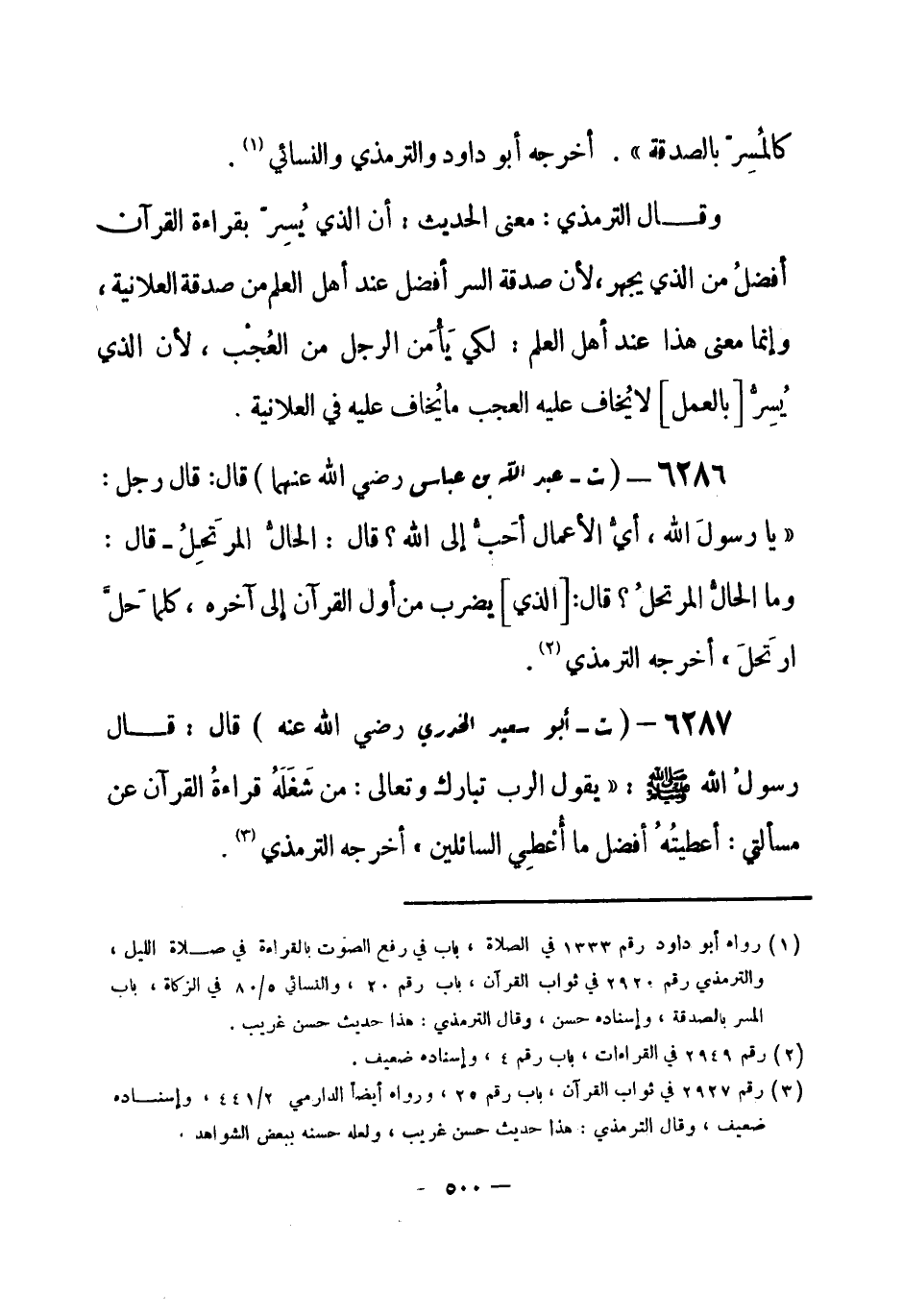 6286 - (ت) عبد الله بن عباس - رضي الله عنهما - قال: قال رجل: «يا رسولَ الله، أيُّ الأعمال أحَبُّ إلى الله؟ قال: الحالُّ المرتَحِلُ - قال: وما الحالُّ المرتحلُ؟ قال: [الذي] يضرب من أول القرآن إلى آخره، كلما حَلَّ ارتَحلَ» أخرجه الترمذي (¬1) .