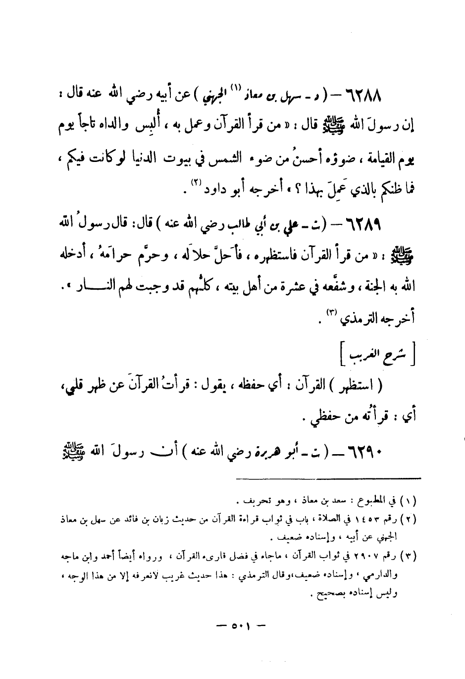 6289 - (ت) علي بن أبي طالب - رضي الله عنه - قال: قال رسولُ الله - صلى الله عليه وسلم-: «من قرأ القرآن فَاستظهره، فأحَلَّ حلالَه، وحرَّم حرامَهُ، أدخله الله بِهِ الجنة، وشفَّعه في عشرة من أهل بيته، كلُّهم قد وجبت لهم النار» . أخرجه الترمذي (¬1) .