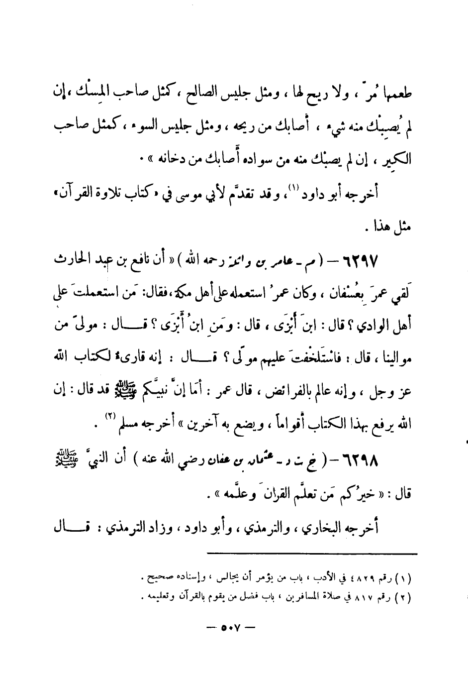 (¬1) رواه البخاري 9 / 66 و 67 في فضائل القرآن، باب خيركم من تعلم القرآن وعلمه، وأبو داود رقم (1452) في الصلاة، باب في ثواب قراءة القرآن، والترمذي رقم (2909) و (2910) في ثواب القرآن، باب ما جاء في تعليم القرآن.