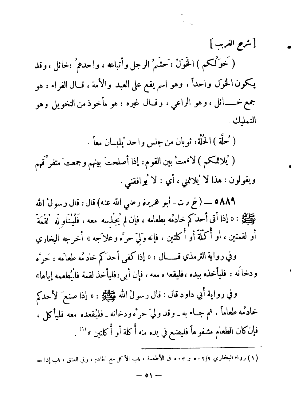 (¬1) رواه البخاري 9 / 502 و 503 في الأطعمة، باب الأكل مع الخادم، وفي العتق، باب إذا -[52]- أتاه خادمه بطعامه، والترمذي رقم (1854) في الأطعمة، باب ما جاء في الأكل مع المملوك، وأبو داود رقم (3846) في الأطعمة، باب في الخادم يأكل مع المولى، ورواه أيضاً مسلم رقم (1663) في الأيمان، باب إطعام المملوك مما يأكل.