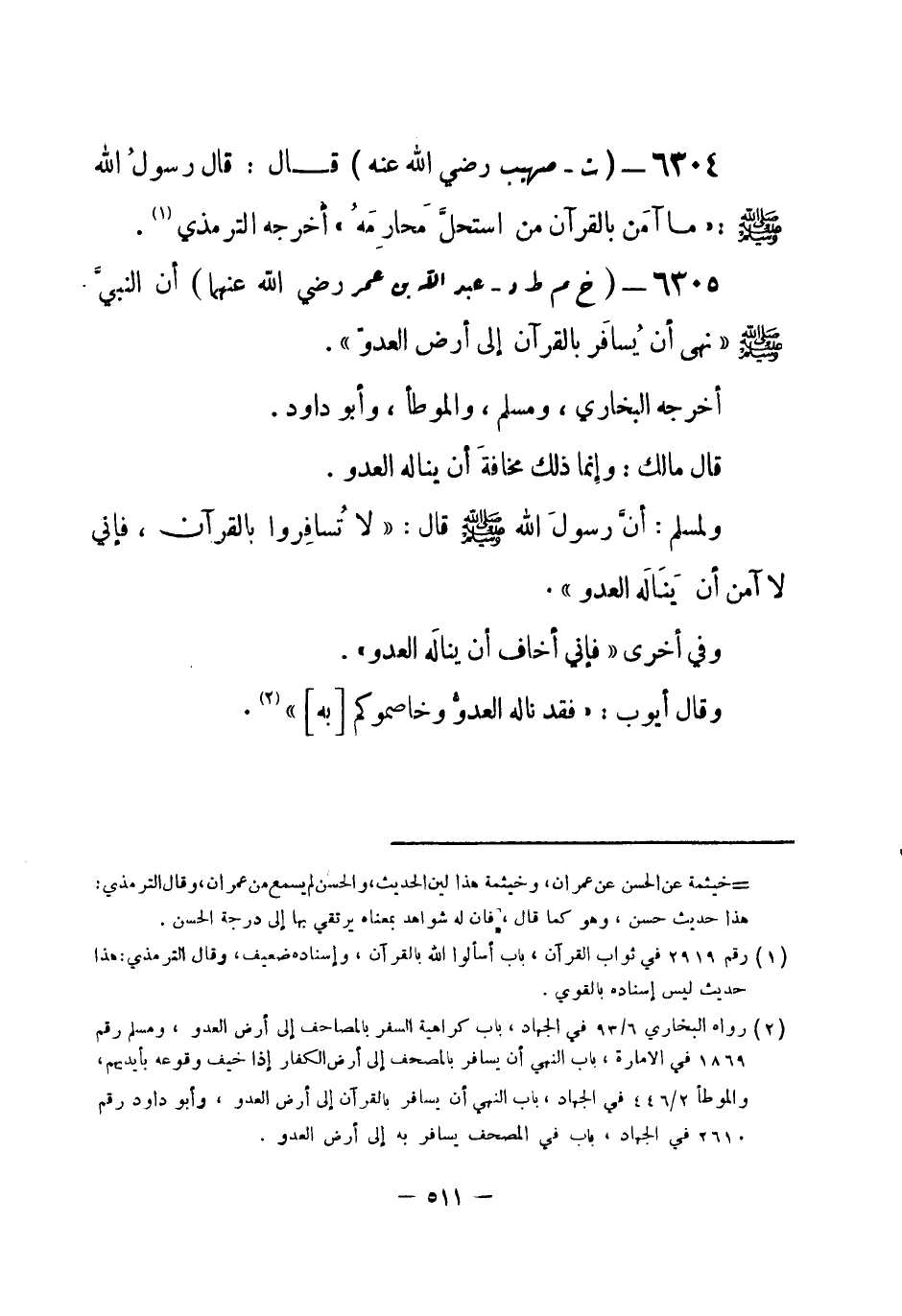 (¬1) رواه البخاري 6 / 93 في الجهاد، باب كراهية السفر بالمصاحف إلى أرض العدو، ومسلم رقم (1869) في الإمارة، باب النهي أن يسافر بالمصحف إلى أرض الكفار إذا خيف وقوعه بأيديهم، والموطأ 2 / 446 في الجهاد، باب النهي أن يسافر بالقرآن إلى أرض العدو، وأبو داود رقم (2610) في الجهاد، باب في المصحف يسافر به إلى أرض العدو.