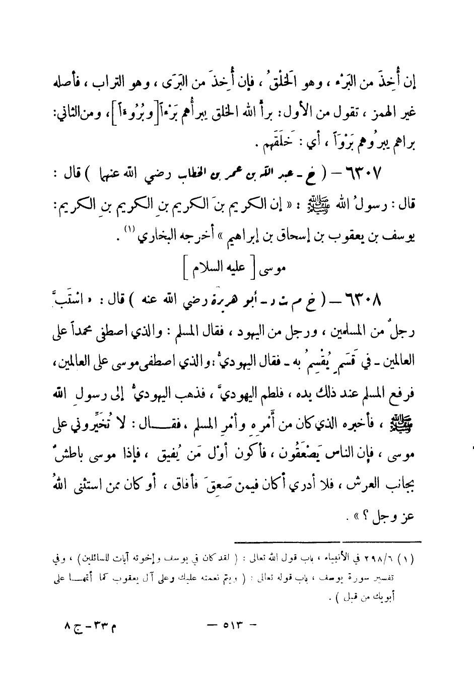 6308 - (خ م ت د) أبو هريرة - رضي الله عنه - قال: «اسْتَبَّ رجل من المسلمين، ورجل من اليهود، فقال المسلم: والذي اصطفى محمداً على العالمين - في قَسَم يُقْسِمُ به - فقال اليهوديُّ: والذي اصطفى موسى على العالمين، فرفع المسلم عند ذلك يده، فلطم اليهوديَّ، فذهب اليهوديُّ إلى رسولِ الله - صلى الله عليه وسلم-، فأخبره الذي كان من أَمْرِهِ وأمْرِ المسلمِ، فقال: لا تُخَيِّروني على موسى، فإن الناسَ يَصْعَقُون، فأكون أول مَن يُفيق، فإذا موسى باطش بجانب العرش، فلا أدري أكان فيمن صَعِقَ فأفاق، أو كان ممن استثنى الله عز وجل؟» . -[514]-