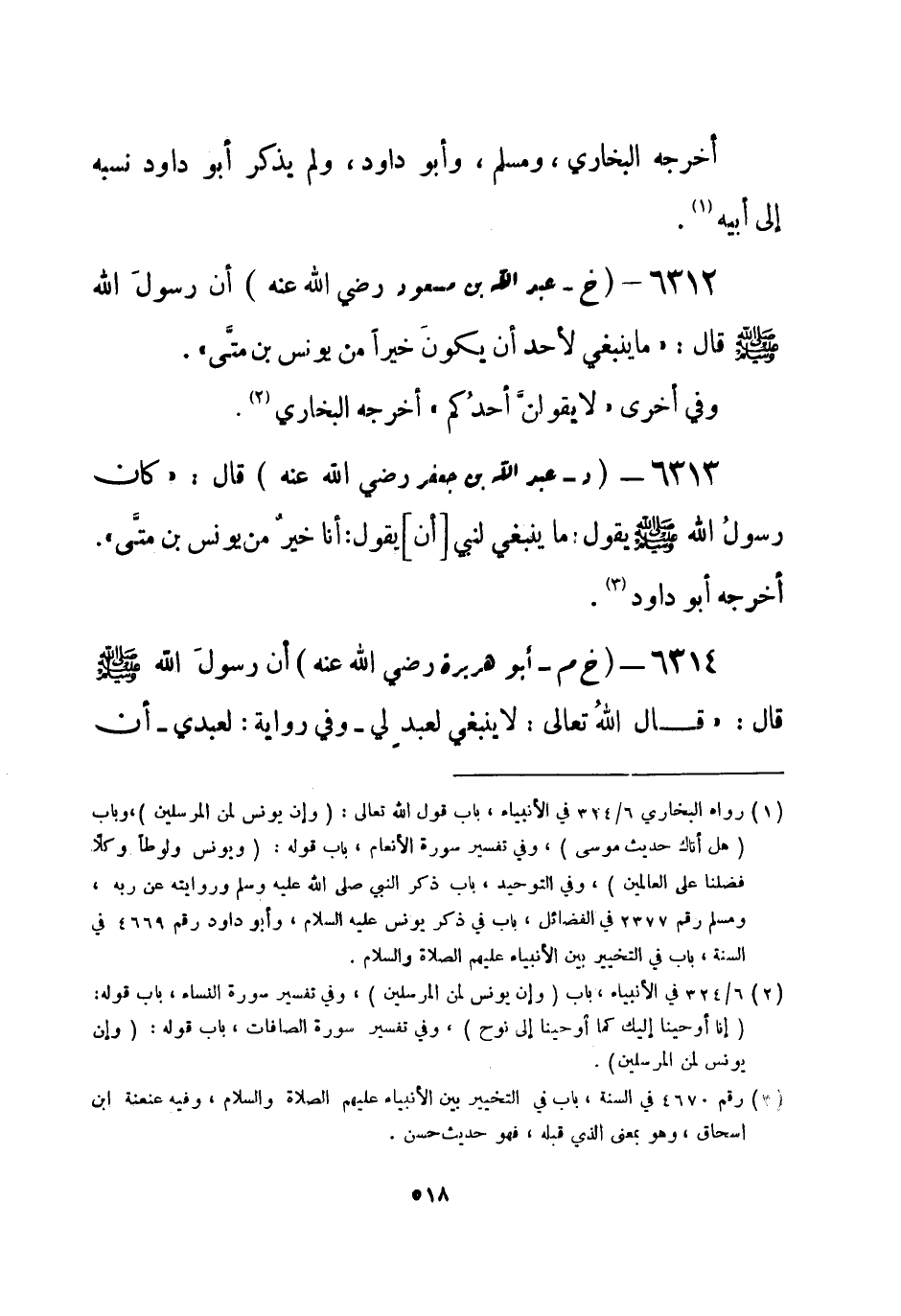 6312 - (خ) عبد الله بن مسعود - رضي الله عنه - أن رسولَ الله - صلى الله عليه وسلم- قال: «ما ينبغي لأحد أن يكونَ خيراً من يونس بن متَّى» .