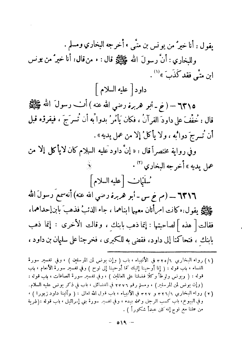 6315 - (خ) أبو هريرة - رضي الله عنه - أن رسولَ الله - صلى الله عليه وسلم- قال: «خُفِّفَ على داودَ القرآنُ، فكانَ يَأْمُرُ بدوابِّه أن تُسرَجَ، فيقرؤه قبل أن تُسرج دوابُّه، ولا يأكلُ إلا من عمل يديه» .