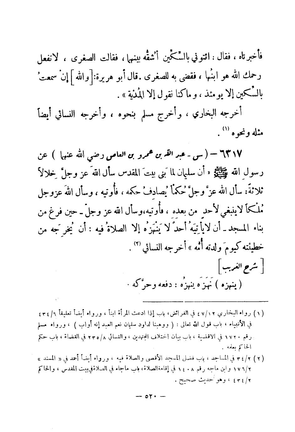 6317 - (س) عبد الله بن عمرو بن العاص - رضي الله عنهما - عن رسولِ الله - صلى الله عليه وسلم-: «أن سليمان لما بَنى بيتَ المقدس سأل الله عز وجلَّ خِلالاً ثلاثة: سأل الله عزَّ وجلَّ حُكْماً يُصادِفُ حكمه، فأُوتيه، وسأل الله عز وجل مُلْكاً لا ينبغي لأحد من بعدِهِ، فأُوتيه، وسأل الله عز وجلّ - حين فرغ من بناء المسجد - أن لا يأتِيَهُ أحد لا يَنْهَزُه إلا الصلاةُ فيه: أن يُخرِجَه من خطيئته كيومَ ولدته أُمُّه» أخرجه النسائي (¬1) .