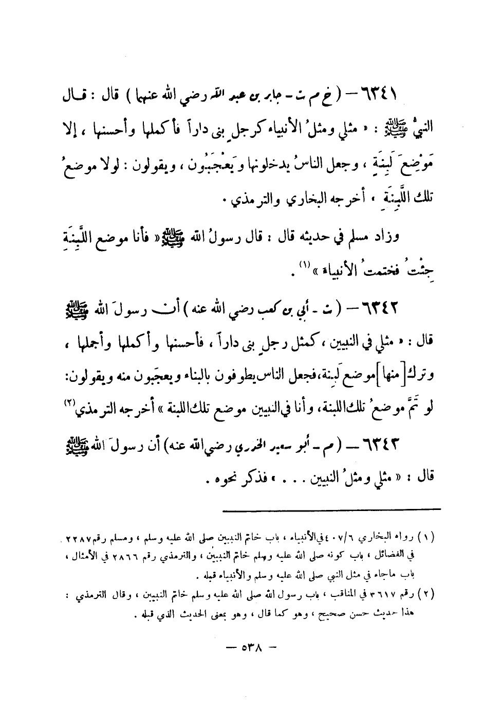 6341 - (خ م ت) جابر بن عبد الله - رضي الله عنهما - قال: قال النبيُّ - صلى الله عليه وسلم-: «مثلي ومثلُ الأنبياء كرجل بنى داراً فأكملها وأحسنها، إلا مَوْضِعَ لَبِنَة، وجعل الناسُ يدخلونها ويَعْجَبُون، ويقولون: لولا موضعُ تلك اللَّبِنَةِ» أخرجه البخاري والترمذي.