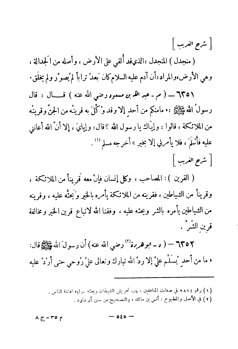 6351 - (م) عبد الله بن مسعود - رضي الله عنه - قال: قال رسولُ الله - صلى الله عليه وسلم-: «ما منكم من أحد إلا وقد وُكِّلَ به قرينُه من الجنِّ وقرينُه من الملائكة، قالوا: وإيّاك يا رسول الله؟ قال: وإيايَ، إِلا أنَّ الله أعانني عليه فأَسْلَمَ، فلا يأمرني إلا بخير» أخرجه مسلم (¬1) .
