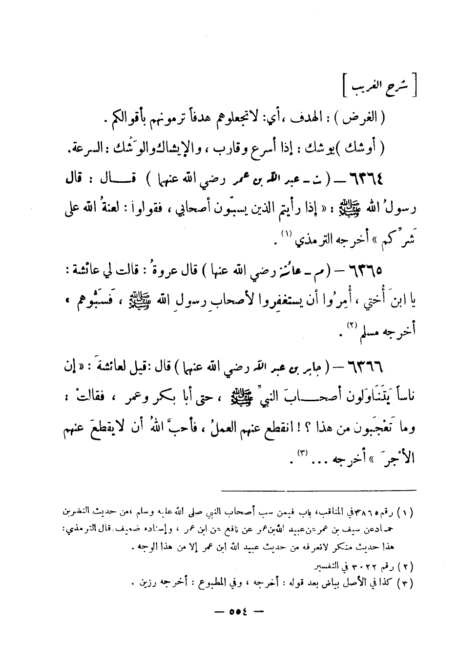 6364 - (ت) عبد الله بن عمر - رضي الله عنهما - قال: قال رسولُ الله - صلى الله عليه وسلم-: «إِذا رأيتم الذين يسبّون أصحابي، فقولوا: لعنةُ الله على شَرِّكم» أخرجه الترمذي (¬1) .