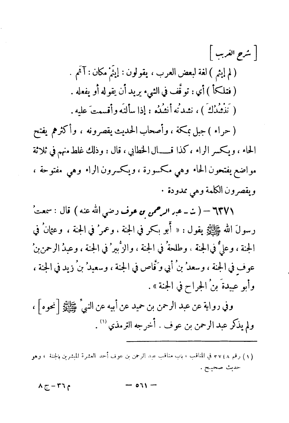 6371 - (ت) عبد الرحمن بن عوف - رضي الله عنه - قال: سمعتُ رسولَ الله - صلى الله عليه وسلم- يقول: «أَبو بكر في الجنة، وعمرُ في الجنة، وعثمانُ في الجنة، وعليّ في الجنة، وطلحةُ في الجنة، والزُّبيرُ في الجنة، وعبد الرحمن بنُ عوف في الجنة، وسعدُ بنُ أبي وَقَّاص في الجنة، وسعيدُ بنُ زيد في الجنة، وأبو عبيدةَ بنُ الجراح في الجنة» .