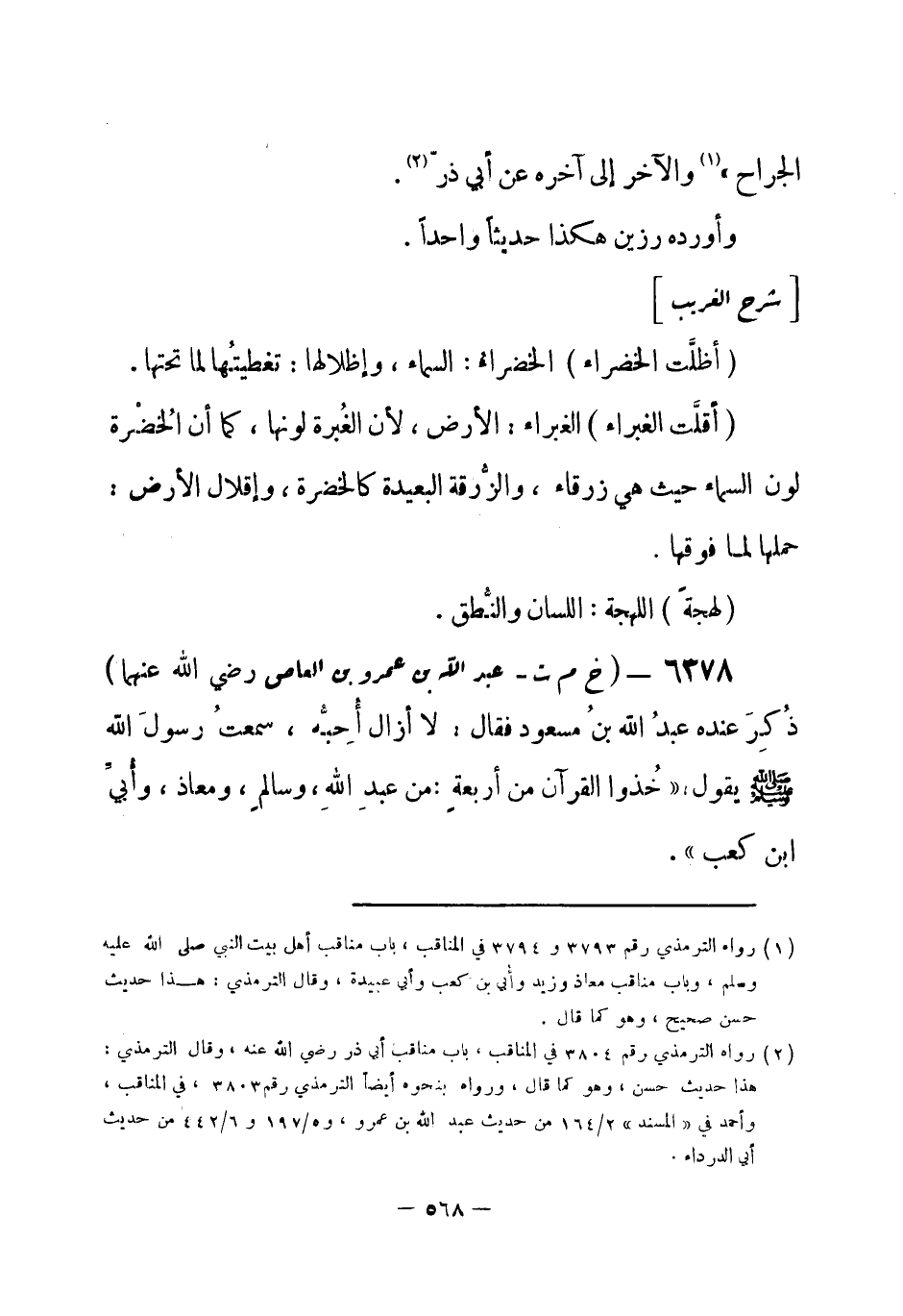 6378 - (خ م ت) عبد الله بن عمرو بن العاص - رضي الله عنهما - ذُكِرَ عنده عبد الله بنُ مسعود، فقال: لا أزال أُحِبُّه، سمعتُ رسولَ الله - صلى الله عليه وسلم- يقول: «خُذوا القرآن من أربعة: من عبد الله، وسالم، ومعاذ، وأُبيِّ بن كعب» . -[569]-