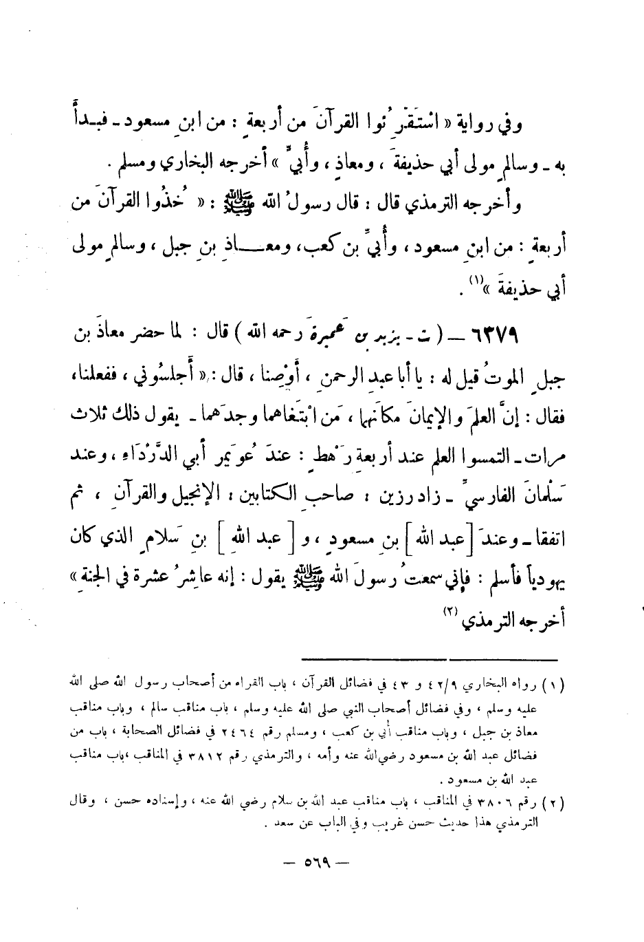 6379 - (ت) يزيد بن عَميرةَ - رحمه الله - قال: لما حضر معاذَ بن جبل الموتُ قيل له: يا أبا عبد الرحمنِ، أَوْصِنا، قال: «أَجلسُوني ففعلنا، فقال: إنَّ العلمَ والإيمانَ مكانَهما، مَن ابْتَغاهما وجدَهما - يقول ذلك ثلاث مرات - التمسوا العلم عند أربعةِ رَهْط: عندَ عُوَيمر أبي الدَّرْدَاءِ، وعند سَلْمَانَ الفارسيِّ - زاد رزين: صاحبِ الكتابين: الإنجيل والقرآنِ، ثم اتفقا - وعندَ [عبد الله] بنِ مسعود، و [عبد الله] بنِ سَلام الذي كان يهودياً فأسلم: فإني سمعتُ رسولَ الله - صلى الله عليه وسلم- يقول: إنه عَاشِرُ عشرة في الجنة» أخرجه الترمذي (¬1) .