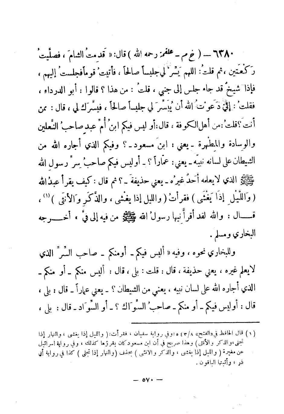 (¬3) رواه البخاري 7 / 71 - 73 في فضائل أصحاب النبي صلى الله عليه وسلم، باب مناقب عمار وحذيفة رضي الله عنهما، ومناقب عبد الله بن مسعود، وفي بدء الخلق، باب صفة إبليس وجنوده، وفي الاستئذان، باب من ألقى له وسادة، وأخرج مسلم الجزء الذي يتعلق بالقراءة فقط رقم (824) في صلاة المسافرين، باب ما يتعلق بالقراءات، ورواه الترمذي أيضاً بمثل رواية مسلم (2940) في القراءات، باب ومن سورة الليل.