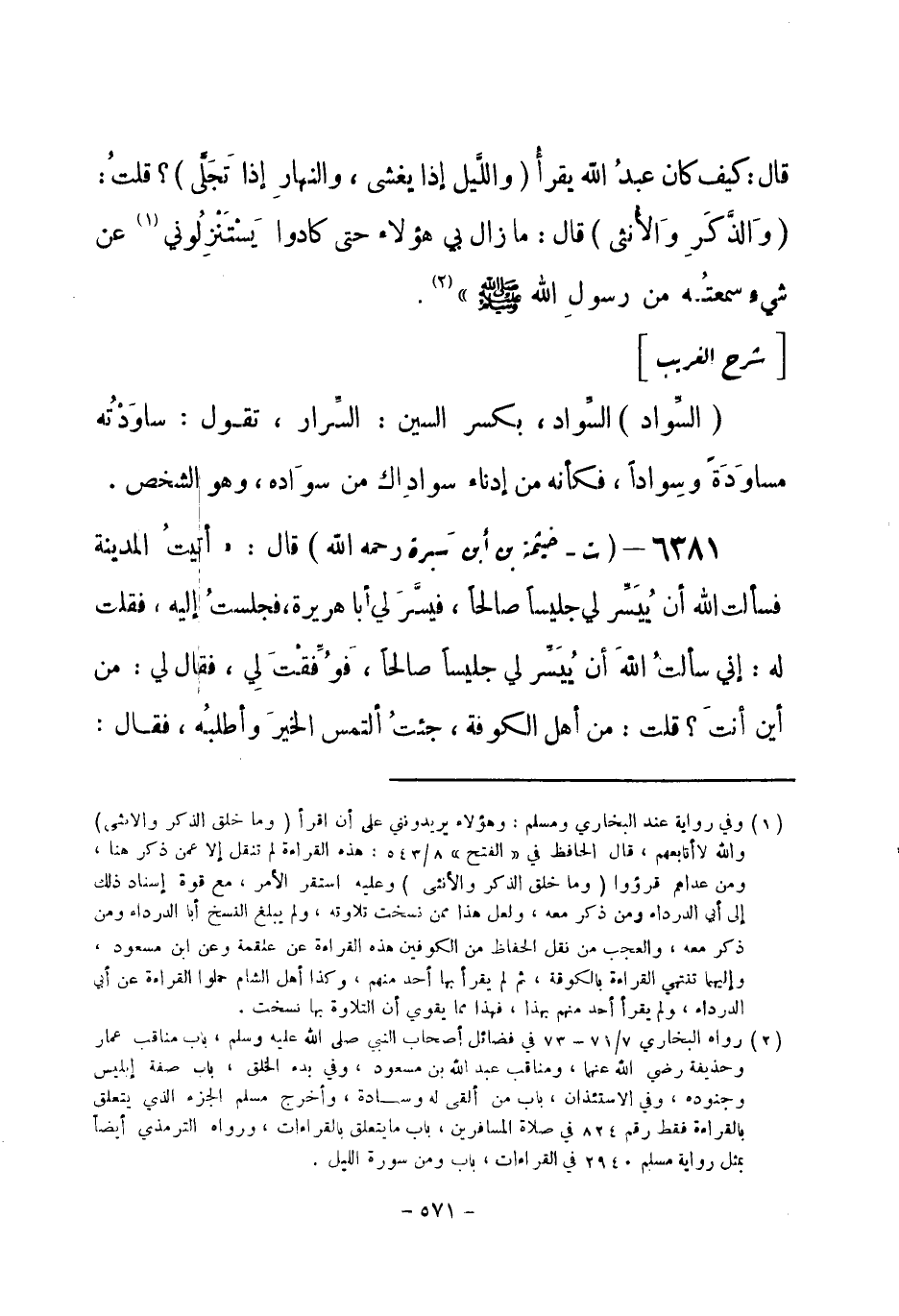 6381 - (ت) خيثمة بن أبي سَبرة - رحمه الله - قال: «أتيتُ المدينة فسألت الله أن يُيَسِّر لي جليساً صالحاً، فيسَّرَ لي أبا هريرة، فجلستُ إليه، فقلت له: إني سألتُ الله أن يُيَسِّر لي جليساً صالحاً، فَوُفِّقْتَ لِي، فقال لي: من أين أنتَ؟ قلت: من أهل الكوفة، جئتُ ألتمس الخيرَ وأطلُبه، فقال: -[572]- أليس فيكم سعدُ بنُ مالك مُجابُ الدعوة؟ وابنُ مسعود، صاحبُ طَهورِ رسولِ الله - صلى الله عليه وسلم- ونعليه؟ وحذيفةُ، صاحبُ سِرِّ رسولِ الله - صلى الله عليه وسلم-؟ وعَمَّارُ الذي أجاره الله من الشيطان على لسان نبيِّه؟ وسَلْمَانُ، صاحبُ الكتابين؟ قال قتادة: والكتابان: الإنجيل والقرآن» أخرجه الترمذي (¬1) .