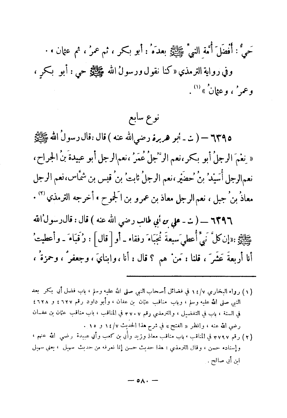 6396 - (ت) علي بن أبي طالب - رضي الله عنه - قال: قال رسولُ الله - صلى الله عليه وسلم-: «إن كلَّ نَبيّ أُعطيَ سبعةَ نُجَبَاءَ رفقاء - أو [قال] : رُقَبَاءَ - وأعطيتُ أنا أربعةَ عَشَرَ، قلنا: مَنْ هم؟ قال: أنا، وابنايَ، وجعفر، وحمزةُ، -[581]- وأبو بكر، وعمرُ، ومُصْعَب بنُ عُمَير، وبلال، وسلمانُ، وعمارُ بنُ ياسر، وعبد الله بنُ مسعود، [وأبو ذر، والمقداد] » أخرجه الترمذي (¬1) .