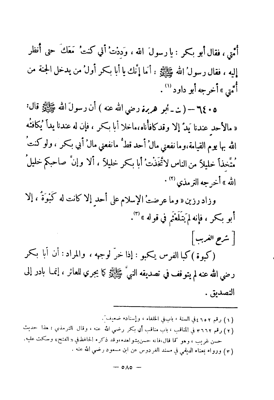 (¬1) رقم (3662) في المناقب، باب مناقب أبي بكر رضي الله عنه، وقال الترمذي: هذا حديث حسن غريب، وهو كما قال، فإنه حسن بشواهده، وقد ذكره الحافظ في " الفتح " وسكت عليه.