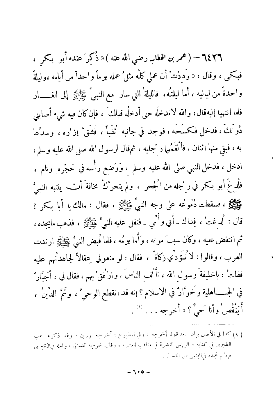 6426 - () عمر بن الخطاب - رضي الله عنه - «ذُكِرَ عنده أبو بكر، فبكى، وقال: وَدِدْتُ أن عملي كلَّه مثلُ عمله يوماً واحداً من أيامه، وليلة واحدة من لياليه، أما ليلتُه، فالليلةُ التي سار مع النبيِّ - صلى الله عليه وسلم- إِلى الغار فلما انتهيا إليه قال: والله لا تدخلَه حتى أدخله قبلكَ، فإن كان فيه شيء أصابني دُونَكَ، فدخل فكسَحَه، فوجد في جانبه ثُقَباً، فَشَقَّ إزاره، وسدَّها به، فبقي منها اثنان، فألْقَمُهما رِجْليه، ثم قال لرسول الله - صلى الله عليه وسلم-: ادخل، فدخل النبي - صلى الله عليه وسلم-، وَوَضع رأْسه في حَجْرهِ ونام، فلُدِغَ أبو بكر في رِجْله من الجُحر، ولم يتحرَّكْ مخافةَ أن ينتبه النبيُّ - صلى الله عليه وسلم-، فسقطت دُمُوعُه على وجه النبيِّ -صلى الله عليه وسلم-، فقال: ما لك يا أبا بكر؟ قال: لُدِغتُ، فِداك - أَبي وأُمِّي - فتفل عليه النبيُّ - صلى الله عليه وسلم-، فذهب ما يجده، ثم انتقض عليه، وكان سببَ موته، وَأَما يومُه، فلما قُبض النبيُّ - صلى الله عليه وسلم- ارتدت العرب، وقالوا: لا نُؤَدِّي زكاة، فقال: لو منعوني عِقالاً لجاهدتُهم عليه، فقلتُ: يا خليفةَ رسولِ الله، تأَلَّفِ الناسَ، وارْفُقْ بهم، فقال لي: أجَبَّار في الجاهلية وخَوَّار في الإسلام؟ إنه قد انقطع الوحيُ، وتَمَّ الدِّينُ، أَيَنْقُصُ وأنا حَيّ؟» أخرجه ... (¬1) . -[606]-