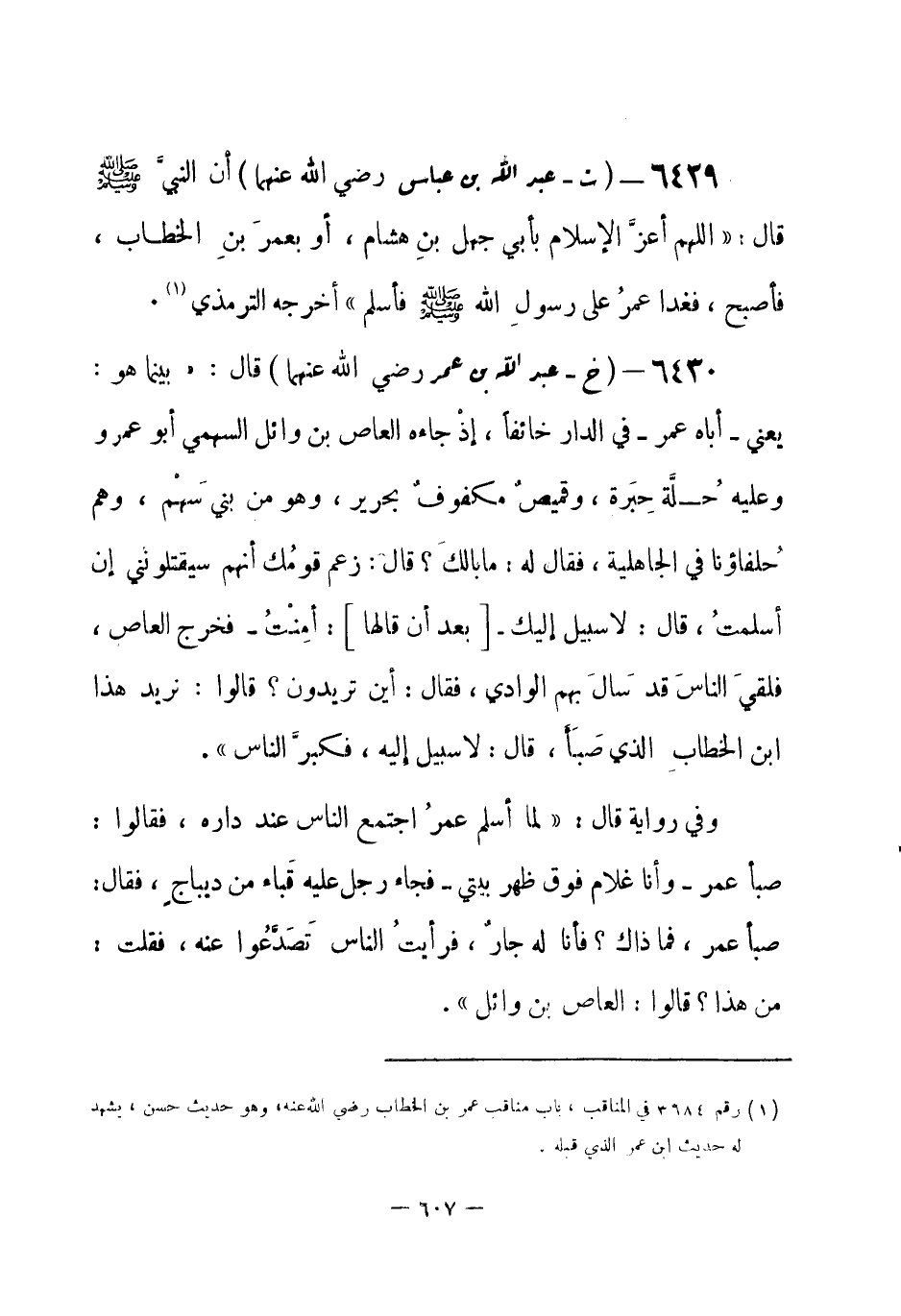 6429 - (ت) عبد الله بن عباس - رضي الله عنهما - أن النبيَّ - صلى الله عليه وسلم- قال: «اللهم أعزَّ الإسلام بأبي جهل بنِ هشام، أو بعمرَ بنِ الخطاب، فأصبح، فغدا عمرُ على رسولِ الله - صلى الله عليه وسلم- فأسلم» أخرجه الترمذي (¬1) .