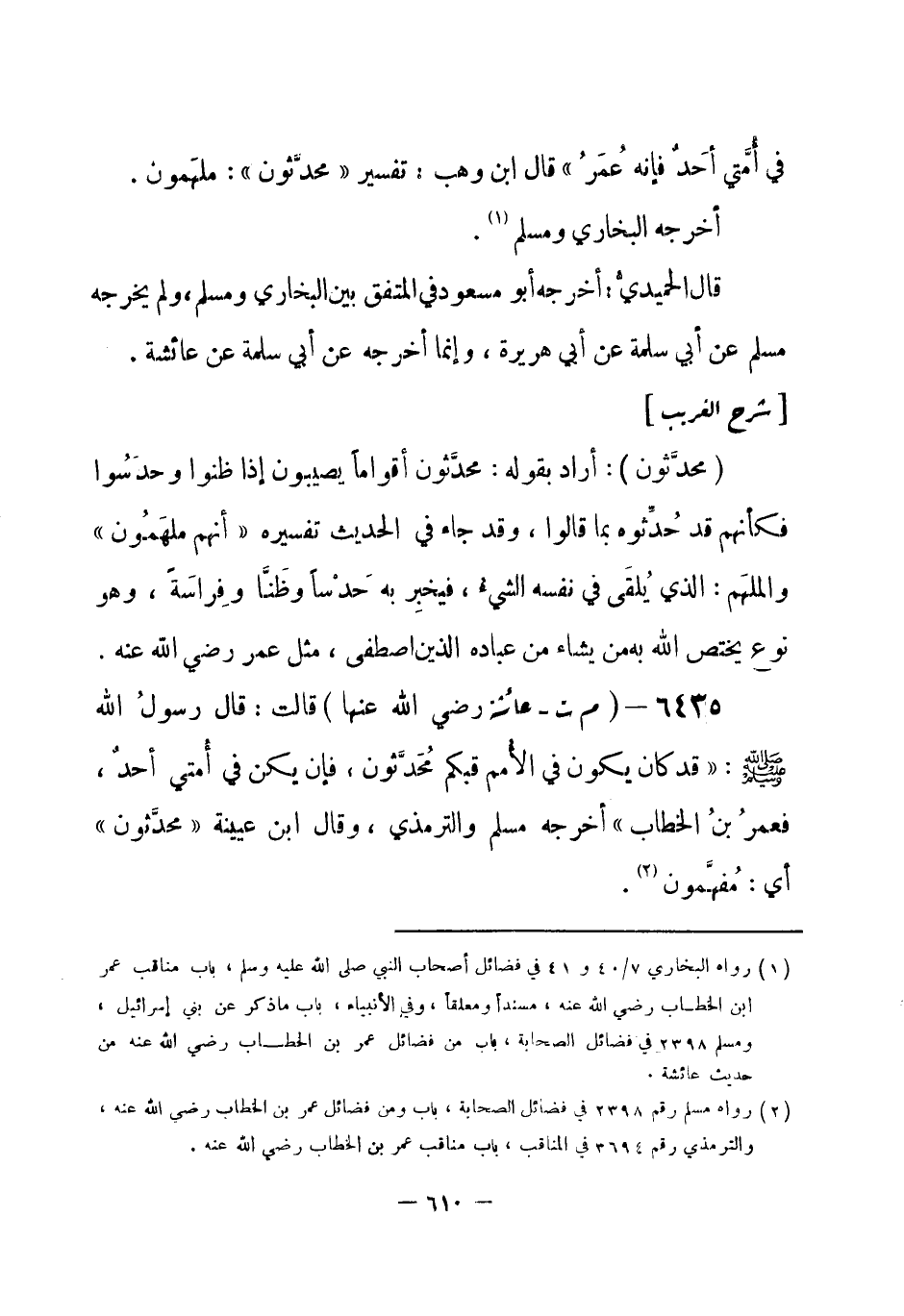 6435 - (م ت) عائشة - رضي الله عنها - قالت: قال رسولُ الله - صلى الله عليه وسلم-: «قد كان يكون في الأُمم قبلكم مُحَدَّثُون، فإن يكن في أُمتي أحد، فعمرُ بنُ الخطاب» أخرجه مسلم والترمذي، وقال ابن عيينة: «محدَّثون» أي: مُفهَّمون (¬1) .