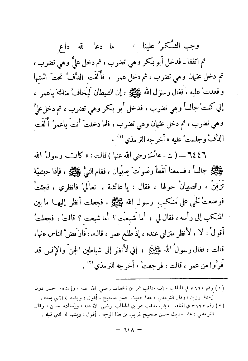 (¬1) رقم (3692) في المناقب، باب مناقب عمر بن الخطاب رضي الله عنه، وإسناده حسن، وقال الترمذي: هذا حديث حسن صحيح غريب من هذا الوجه، أقول: ويشهد له الذي قبله.