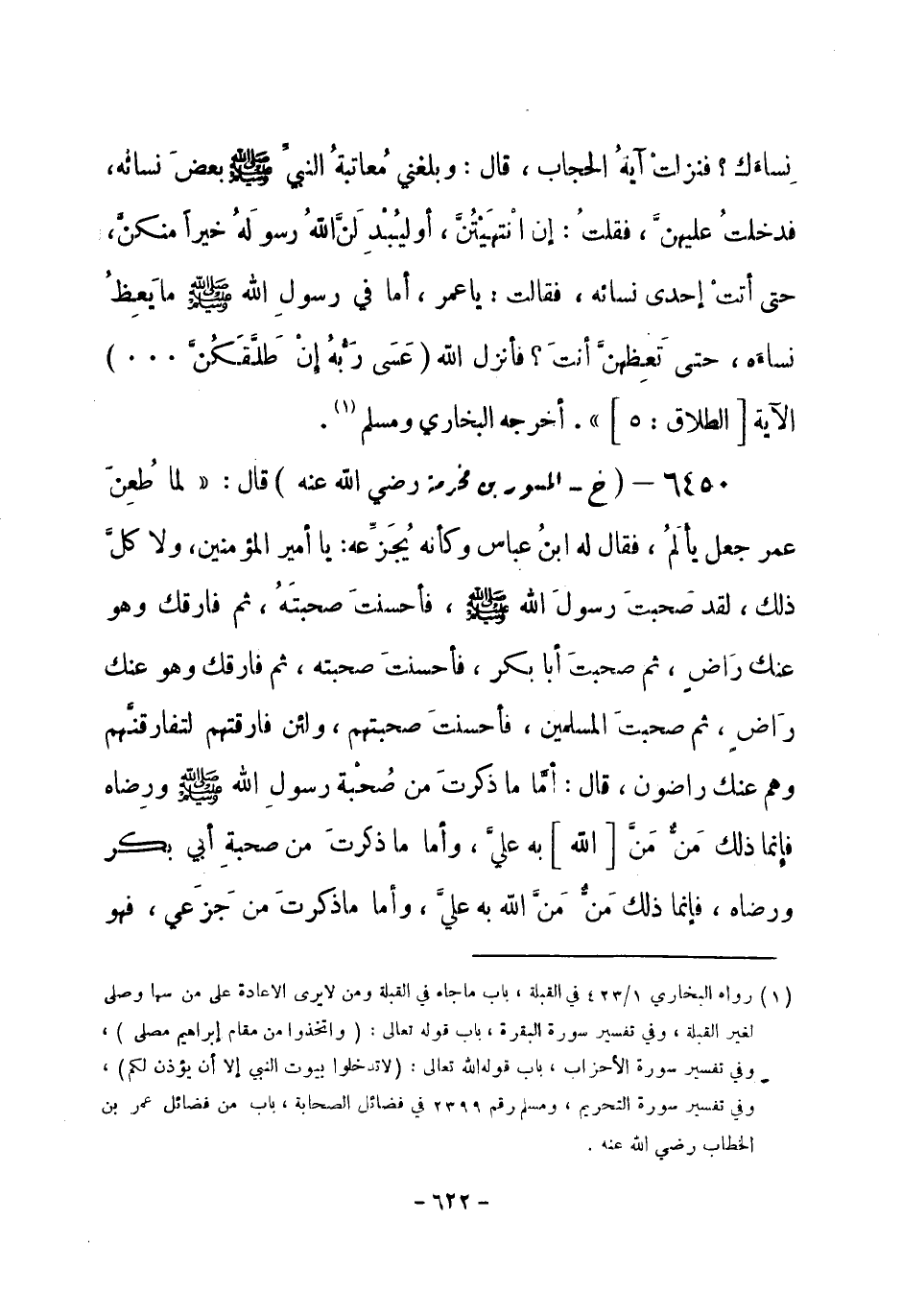 6450 - (خ) المسور بن مخرمة - رضي الله عنه - قال: «لما طُعِنَ عمر جعل يأْلَمُ، فقال له ابنُ عباس وكأنه يُجَزِّعه: يا أمير المؤمنين، ولا كلَّ ذلك، لقد صَحبتَ رسولَ الله - صلى الله عليه وسلم-، فأحسنتَ صحبتَهُ، ثم فارقك وهو عنك رَاض، ثم صحبتَ أبا بكر، فأَحسنتَ صحبته، ثم فارقك وهو عنك رَاض، ثم صحبتَ المسلمين، فأحسنتَ صحبتهم، ولئن فارقتهم لتفارقنَّهم وهم عنك راضون، قال: أمَّا ما ذكرتَ من صُحْبة رسولِ الله - صلى الله عليه وسلم- ورِضاه فإنما ذلك مَنٌّ مَنَّ [الله] به عليَّ، وأما مَا ذكرتَ من صحبةِ أبي بكر ورضاه، فإنما ذلك مَنٌّ مَنَّ الله به عليَّ، وأما ما ذكرتَ من جَزَعي، فهو -[623]- من أجلك ومن أجل أصحابك، واللهِ لو أن لي طِلاع الأرض ذهباً لافتديتُ به من عذاب الله قبل أن أراه» أخرجه البخاري (¬1) .