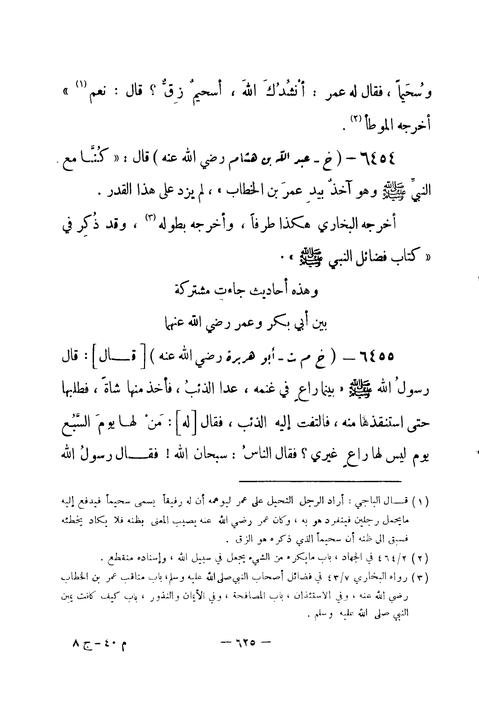 (¬1) رواه البخاري 7 / 43 في فضائل أصحاب النبي صلى الله عليه وسلم، باب مناقب عمر بن الخطاب رضي الله عنه، وفي الاستئذان، باب المصافحة، وفي الأيمان والنذور، باب كيف كانت يمين النبي صلى الله عليه وسلم.