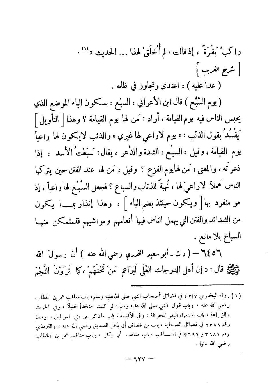6456 - (د ت) أبو سعيد الخدري - رضي الله عنه - أن رسولَ الله - صلى الله عليه وسلم- قال: «إن أهل الدرجات العُلَى لَيَرَاهم مَنْ تَحْتَهُمْ، كما تَرَوْنَ النَّجْمَ -[628]- الطالع في أُفُقِ السماء، وإِن أبا بكر وعمر منهم، وأَنْعَمَا» . أخرجه أبو داود والترمذي.