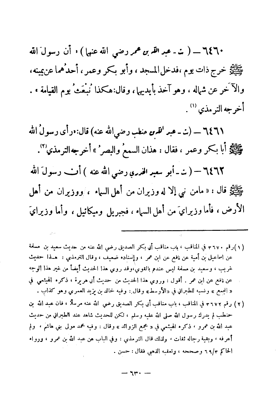 6460 - (ت) عبد الله بن عمر - رضي الله عنهما - «أن رسولَ الله - صلى الله عليه وسلم- خرج ذات يوم، فدخل المسجد، وأبو بكر وعمر، أحدُهما عن يمينه، والآخَر عن شماله، وهو آخذ بأيديهما، وقال: هكذا نُبْعَثُ يوم القيامة» . أخرجه الترمذي (¬1) .