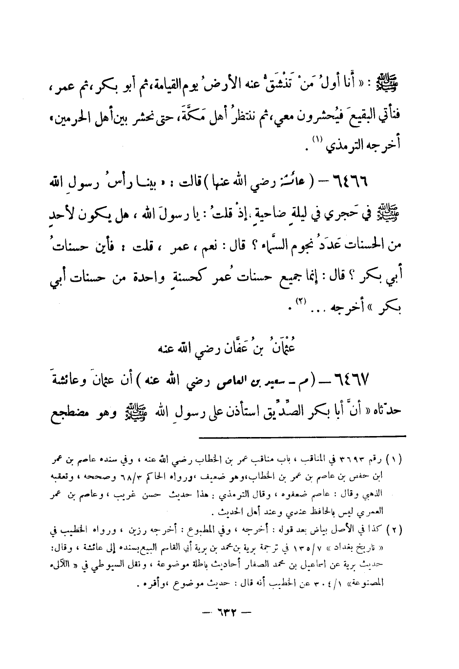 6466 - () عائشة - رضي الله عنها - قالت: «بينا رأسُ رسولِ الله - صلى الله عليه وسلم- في حَجري في ليلة ضاحية، إذْ قلتُ: يا رسولَ الله، هل يكون لأحد من الحسنات عَدَدُ نجوم السَّماء؟ قال: نعم، عمر، قلتُ: فأين حسناتُ أبي بكر؟ قال: إنما جميع حسناتُ عمر كحسنة واحدة من حسنات أبي بكر» أخرجه ... (¬1) .
