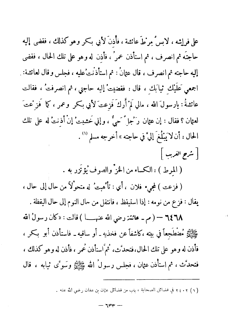 6468 - (م) عائشة - رضي الله عنها - قالت: «كان رسولُ الله - صلى الله عليه وسلم- مُضْطَجِعاً في بيته، كاشفاً عن فخذيه - أو ساقيه - فاستأذن أبو بكر، فأذن له وهو على تلك الحال، فتحدَّث، ثُمَّ استأذن عُمر، فأذن له وهو كذلك، فتحدَّث، ثم استأذن عثمان، فجلس رسولُ الله - صلى الله عليه وسلم- وسَوَّى ثيابه، قال -[634]- محمد - يعني ابن أبي حَرْملةَ - ولا أقول ذلك في يوم واحد، فدخل فتحدَّث، فلما خرج قالت عائشة: دخل أبو بكر، فلم تَهِشَّ ولم تُبالِهِ، ثم دخل عمر، فلم تَهِشَّ له ولم تباله، ثم دخل عثمان، فجلسْتَ وسوّيتَ ثيابكَ؟ فقال: ألا أستَحيي ممن تستَحي منه الملائكة» أخرجه مسلم (¬1) .