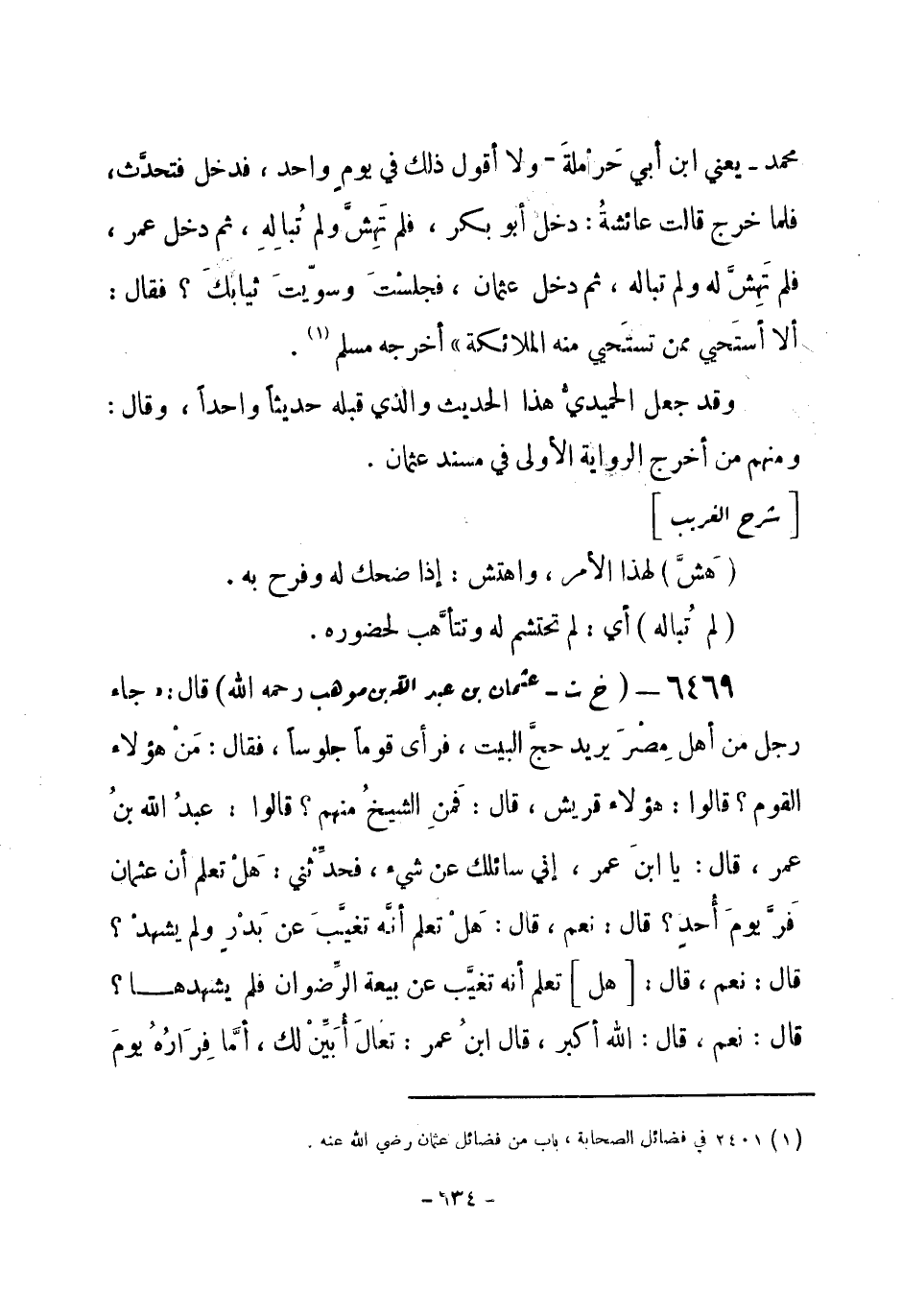 6469 - (خ ت) عثمان بن عبد الله بن موهب - رحمه الله - قال: «جاء رجل من أهل مِصْرَ يريد حجَّ البيت، فرأى قوماً جلوساً، فقال: مَنْ هؤلاء القوم؟ قالوا: هؤلاء قريش، قال: فَمَنِ الشيخُ منهم؟ قالوا: عبد الله بنُ عمر، قال: يا ابنَ عمر، إني سائلك عن شيء، فحدِّثْني: هَلْ تعلم أن عثمان فَرَّ يومَ أُحد؟ قال: نعم، قال: هَلْ تعلم أنَّهُ تغيَّبَ عن بَدْر ولم يشهدْ؟ قال: نعم، قال: [هل] تعلم أنه تغيَّب عن بيعة الرِّضوان فلم يشهدها؟ قال: نعم، قال: الله أكبر، قال ابنُ عمر: تعالَ أُبَيِّنْ لك، أمَّا فِرَارُهُ يومَ -[635]- أُحد، فأشهدُ أنَّ الله عفا عنه [وغفر له] ، وأما تَغَيُّبُهُ عن بدر، فإنه كان تحته رُقيِّةُ بنتُ رسولِ الله - صلى الله عليه وسلم-، وكانت مريضة، فقال له رسولُ الله - صلى الله عليه وسلم-: إن لكَ أَجْرَ رَجُل مِمَّن شهد بدراً وسهمَه، وأما تَغَيُّبُهُ عن بَيْعَةِ الرضوان، فلو كان أحَد أعزَّ ببطنِ مكة من عثمان لبعثه، فبعثَ رسولُ الله - صلى الله عليه وسلم- عثمان، وكانت بيعةُ الرضوان بعدما ذهب عثمان إلى مكةَ، فقالَ رسولُ الله - صلى الله عليه وسلم- بيده اليمنى: هذه يَدُ عثمان، فضرب بها على يده، وقال: هذه لعثمان، ثم قال ابن عمر: اذهب بها الآن معك» . أخرجه البخاري والترمذي - وزاد الترمذي بعد قوله: «فأشهدُ أنَّ الله عفا عنه» قال: «وغَفَرَ له» (¬1) .
