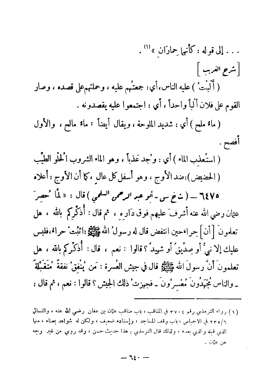 6475 - (ت خ س) أبو عبد الرحمن السلمي قال: «لمَّا حُصِرَ عثمان - رضي الله عنه- أشرفَ عليهم فوق دَارِهِ، ثم قال: أُذكِّرِكم بالله، هل تعلمونَ [أن] حِراءَ حين انتفض قال له رسولُ الله - صلى الله عليه وسلم-: اثبُتْ حراءُ، فليس عليك إلا نبيّ أو صِدِّيق أو شهيد؟ قالوا: نعم، قال: أُذكِّركم بالله، هل تعلمونَ أنَّ رسولَ الله - صلى الله عليه وسلم- قال في جيش العُسرة: مَن يُنْفِقُ نفقة مُتَقَبَّلة - والناس مُجْهَدُونَ مُعْسِرُونَ - فجهزتُ ذلك الجيش؟ قالوا: نعم، ثم قال: -[641]- أذكِّركم بالله، هل تعلمون أن رُومَةَ، لم يكن يشرب منها أحد إلا بثمن، فابتعتُها فجعلتُها للغني والفقير وابنِ السبيل؟ قالوا: اللهم نعم، وأشياءَ عدَّها» هذه رواية الترمذي (¬1) .
