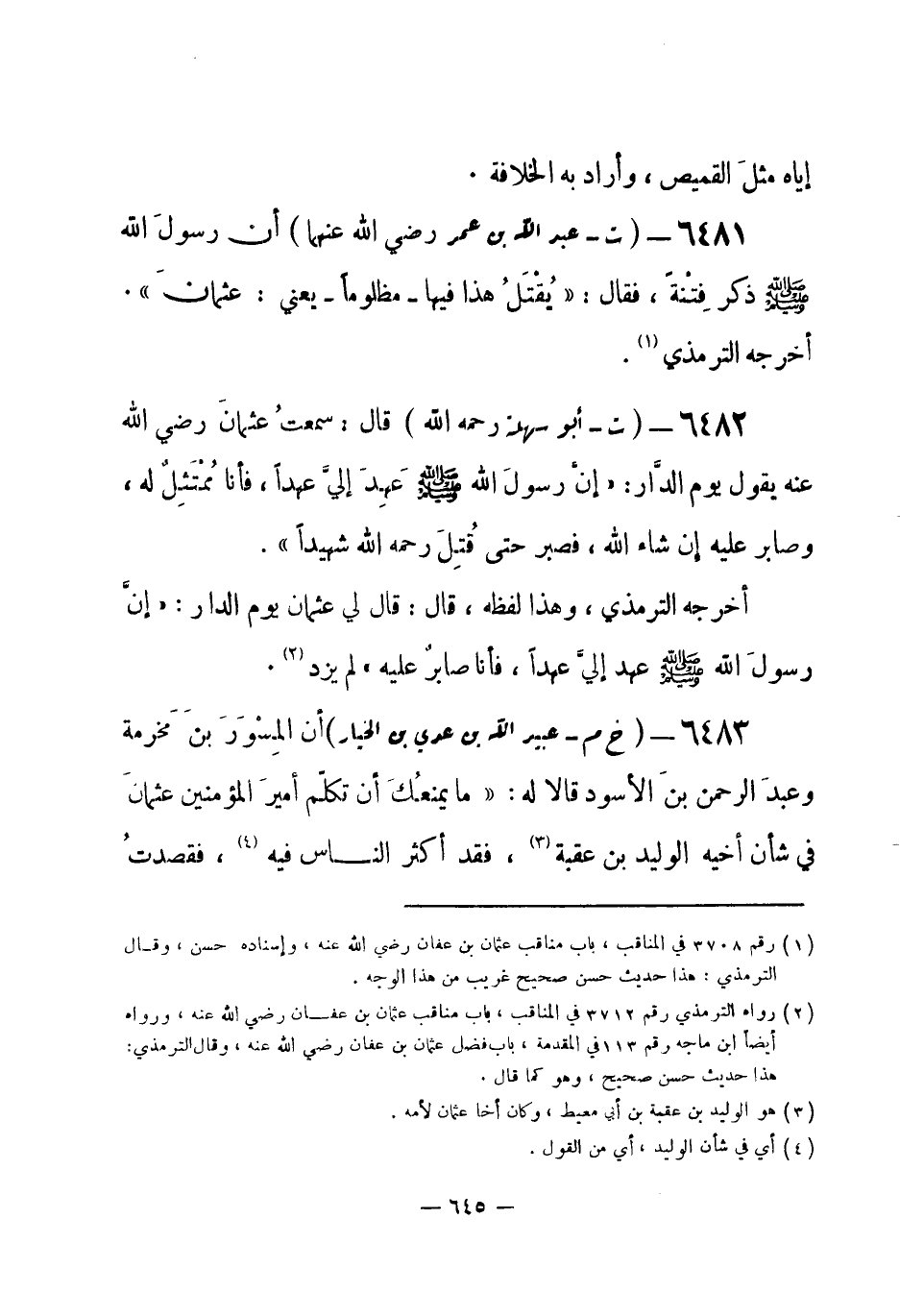 6481 - (ت) عبد الله بن عمر - رضي الله عنهما - أن رسولَ الله - صلى الله عليه وسلم- ذكر فِتْنة، فقال: «يُقْتَلُ هذا فيها - مظلوماً - يعني: عثمانَ» . أخرجه الترمذي (¬1) .