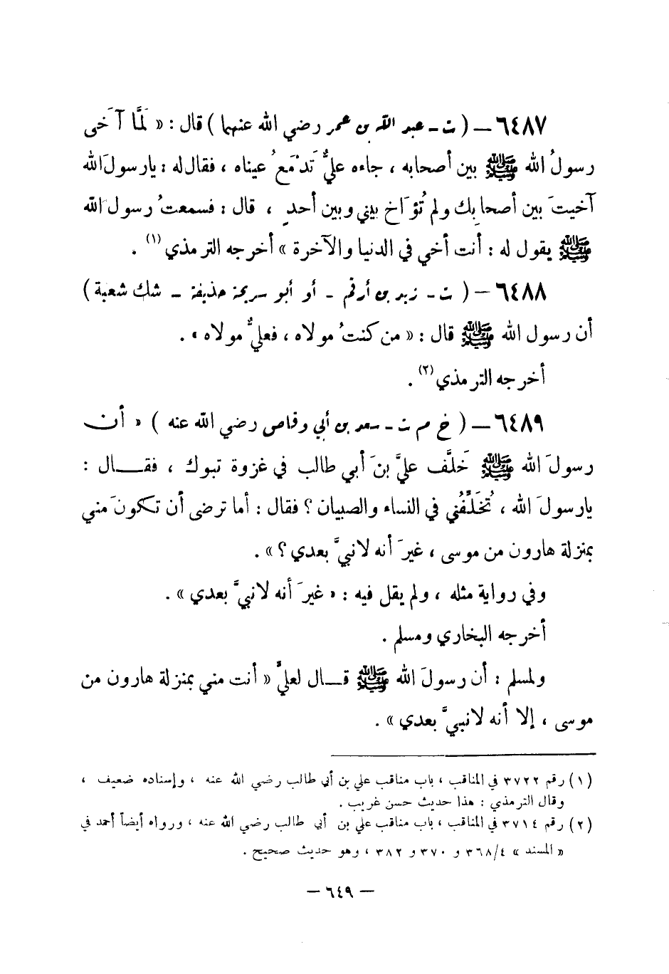 (¬1) رواه البخاري في المغازي، باب غزوة تبوك، وفي فضائل أصحاب النبي صلى الله عليه وسلم، باب مناقب علي بن أبي طالب رضي الله عنه، ومسلم رقم (2404) في فضائل أصحاب النبي صلى الله عليه وسلم، باب من فضائل علي بن أبي طالب رضي الله عنه، والترمذي رقم (3731) في المناقب، باب مناقب علي بن أبي طالب رضي الله عنه.