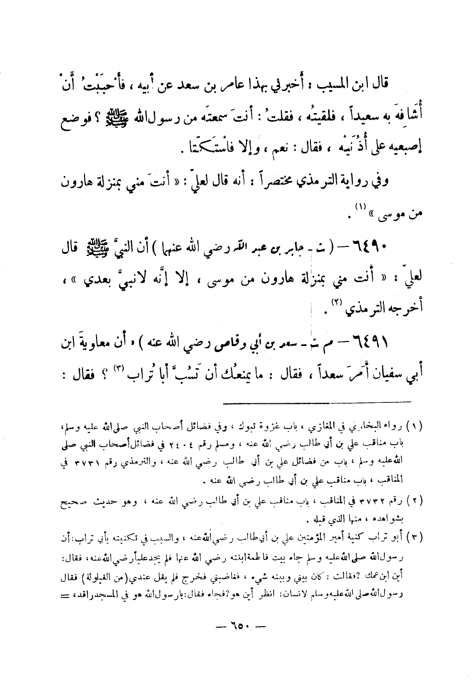 6490 - (ت) جابر بن عبد الله - رضي الله عنهما - أن النبيَّ - صلى الله عليه وسلم- قال لعليٍّ: «أَنت مني بمنزلة هارون من موسى، إلا إنَّه لا نبيَّ بعدي» ، أخرجه الترمذي (¬1) .