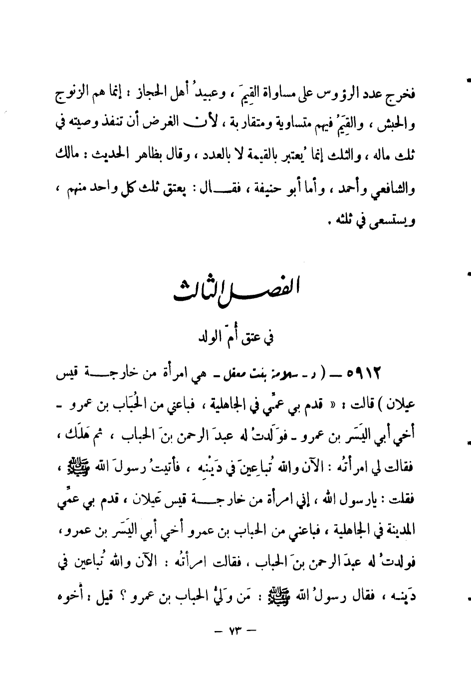 5912 - (د) سلامة بنت معقل - هي امرأة من خارجة قيس عيلان- قالت: «قدم بي عمِّي في الجاهلية، فباعني من الحُبَاب بن عمرو - أخي أبي اليَسَر بن عمرو - فَوَلَدتُ له عبد الرحمن بنَ الحَباب، ثم هَلَكَ، فقالت لي امرأتُه: الآن والله تُباعِين في دَيْنِه، فأتيتُ رسولَ الله - صلى الله عليه وسلم-، فقلت: يا رسول الله، إني امرأة من خارجة قيس عَيلان، قدم بي عمِّي المدينة في الجاهلية، فباعني من الحباب بن عمرو أخي أبي اليَسَر بن عمرو، فولدتُ له عبد الرحمن بنَ الحباب، فقالت امرأتُه: الآن والله تُباعين في دَينه، فقال رسولُ الله - صلى الله عليه وسلم-: مَن وَليُّ الحباب بن عمرو؟ قيل: أخوه -[74]- أبو اليَسَر بن عمرو. فبعث إِليه رسولُ الله - صلى الله عليه وسلم-، فقال: أعتقوها، فإذا سمعتم برقيق قدم عليَّ فَائْتُوني به أُعَوِّضْكم منها، قالت: فأعتقوني، وقَدِمَ على رسول الله - صلى الله عليه وسلم- رقيق، فعوّضهم مني غلاماً» . أخرجه أبو داود (¬1) .